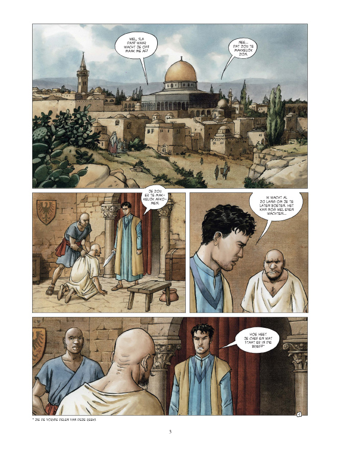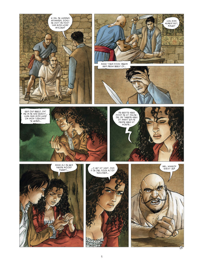 In Jeruzalem slaagt Giovanni erin om een van de mysterieuze, in het rood gehulde mannen te vatten die zijn meester Lucius hebben doodgemarteld. Toch kan hij zijn wraakgevoelens onderdrukken. Zijn ziel blijft onbedorven en met een gerust hart vraagt hij de knappe Esther ten huwelijk. Er breken heerlijk romantische tijden aan tot het lot hen inhaalt en Giovanni’s verleden lelijk opspeelt ... De ontknoping van dit spannende en mystieke avontuur. Getekend door ervaren rot Griffo (SOS Geluk, Giacomo C. en vele andere). Scenario van Rodolphe naar de gelijknamige bestseller en met de hulp van de schrijver. In de trant van historische avonturenreeksen als De 7 levens van de sperwer.