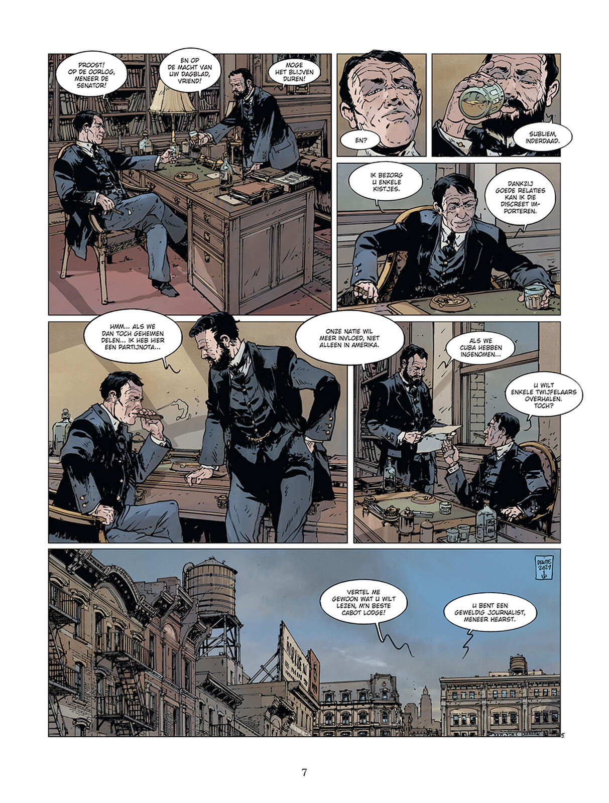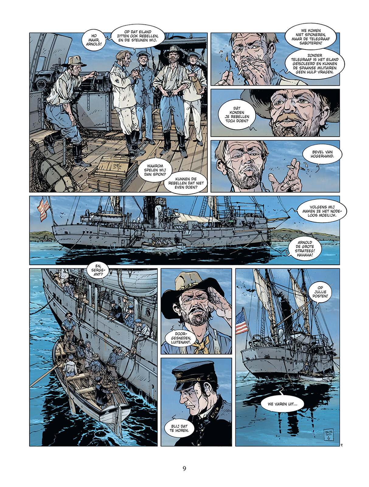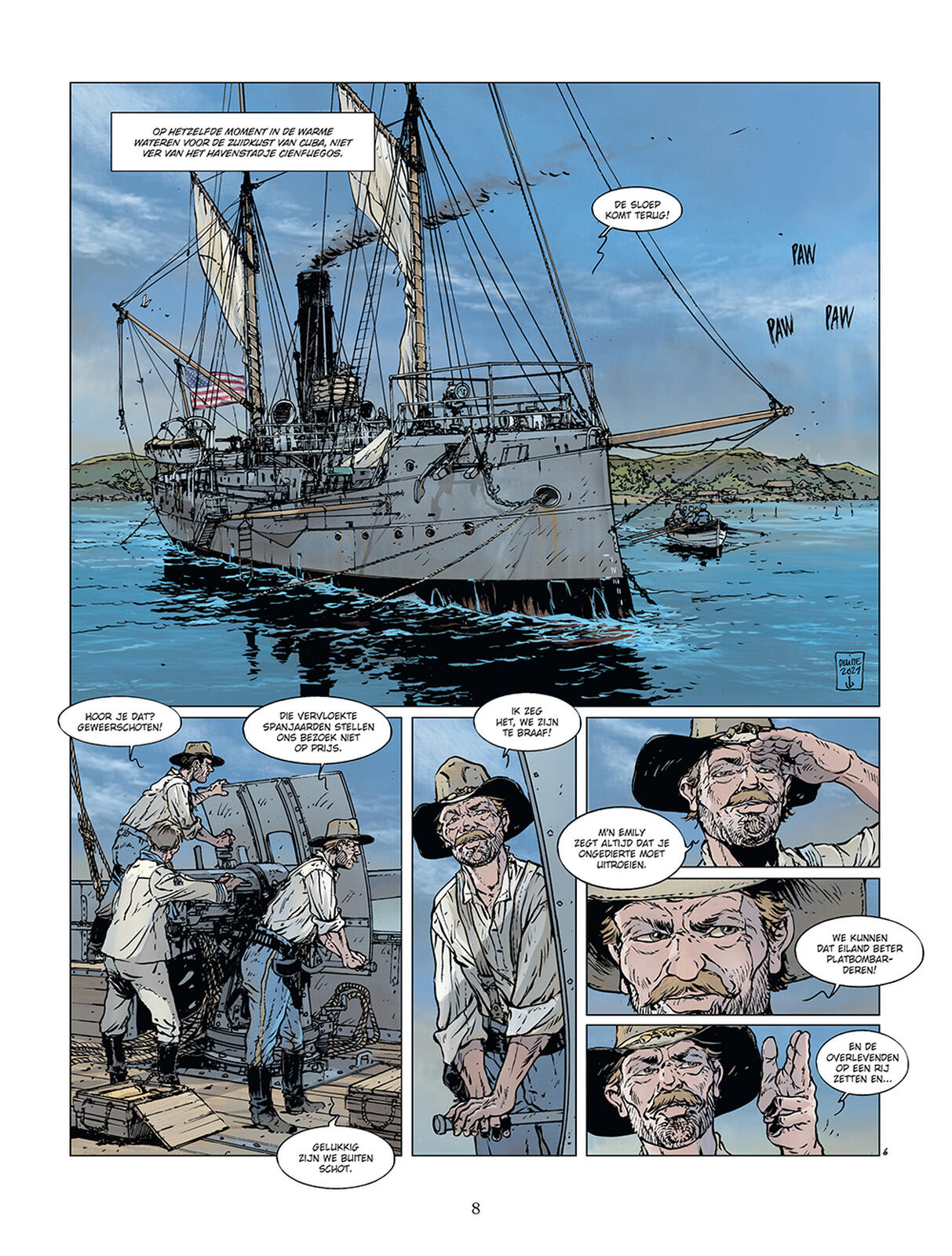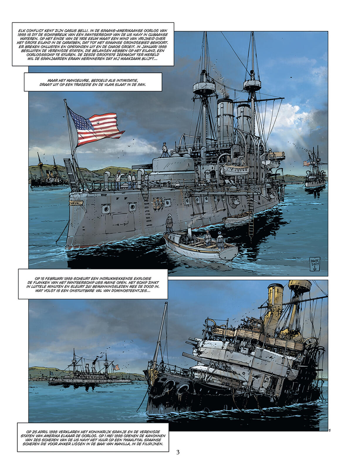 In januari 1898, als getuigen van de burgerlijke onrust die al enkele jaren het grote eiland Cuba, nog steeds een Spaans territorium, teistert, besluiten de Verenigde Staten een van hun oorlogsschepen te sturen. Als de zesde maritieme macht ter wereld wil het hiermee aan de strijdende partijen herinneren dat het de gebeurtenissen nauwlettend in de gaten houdt. Het moet gezegd worden dat de Verenigde Staten enkele economische belangen op het eiland hebben. Helaas verandert wat slechts een intimidatiemanoeuvre had moeten zijn in een tragedie. Terwijl de nacht valt over de kalme wateren van de haven van Havana, op 15 februari 1898, verscheurt een indrukwekkende explosie de flanken van de USS Maine. Het is 21:40 en het Amerikaanse slagschip zinkt binnen enkele minuten. Ongeval, aanslag, wat maakt het uit, de Amerikaanse president, William Mc Kinley, die het conflict wilde vermijden, kan niet lang aarzelen. Aangewakkerd door een vurige pers die om wraak schreeuwt, breekt de oorlog tussen de twee naties uit op 25 april 1898. De zaken escaleren snel. Hoewel de Spaanse krachten op papier veel sterker lijken, wordt het eiland binnen enkele weken geïsoleerd, een maritieme blokkade is opgezet rond Santiago de Cuba, en de Amerikaanse krachten maken snel vorderingen op land. Voor admiraal Pascual Cervera y Topete is de enige uitweg om uit de val te ontsnappen het doorbreken van de maritieme blokkade. Maar zijn vloot is zwak in vergelijking met de indrukwekkende armada van de US Navy. Op 3 juli 1898 vindt het langverwachte en door sommigen gevreesde confrontatie plaats! Historici hebben meer dan een halfduizend zeeslagen geteld die een rol hebben gespeeld in de wereldgeschiedenis. Jean-Yves Delitte, officiële schilder van de Marine en expert in maritieme geschiedenis, heeft er twintig geselecteerd onder de meest significante. Deze keuze biedt een breed overzicht van meer dan 2.500 jaar geschiedenis. Dus, ga mee op een reis door de tijd!