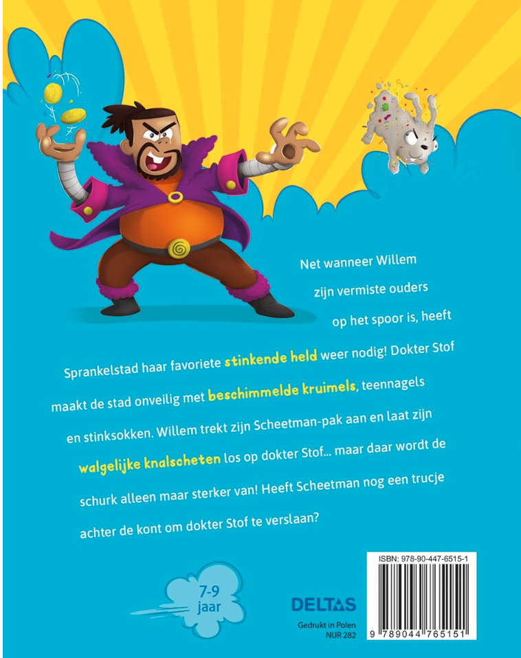 Dokter Stof maakt de stad onveilig met beschimmelde kruimels, teennagels en stinksokken. Willem trekt zijn Scheetman-pak aan en laat zijn walgelijke knalscheten los op dokter Stof… maar daar wordt de schurk alleen maar sterker van! Heeft Scheetman nog een trucje achter de kont om dokter Stof te verslaan? Ideaal voor fans van Kapitein Onderbroek en Dog Man!