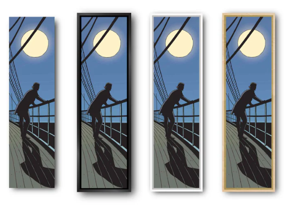 Onze Amerikaanse baklijsten in "L"-profiel worden met de hand in Frankrijk gemaakt van massief hout. Deze frames bieden een elegante esthetiek zonder af te leiden van het kunstwerk. Ze zijn verkrijgbaar in verschillende afwerkingen om te passen bij de sfeer van stripverhalen.