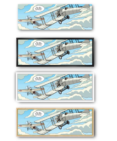 Onze Amerikaanse baklijsten in "L"-profiel worden met de hand in Frankrijk gemaakt van massief hout. Deze frames bieden een elegante esthetiek zonder af te leiden van het kunstwerk. Ze zijn verkrijgbaar in verschillende afwerkingen om te passen bij de sfeer van stripverhalen.