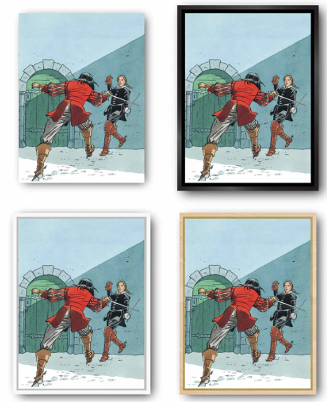 Onze Amerikaanse baklijsten in "L"-profiel worden met de hand in Frankrijk gemaakt van massief hout. Deze frames bieden een elegante esthetiek zonder af te leiden van het kunstwerk. Ze zijn verkrijgbaar in verschillende afwerkingen om te passen bij de sfeer van stripverhalen.