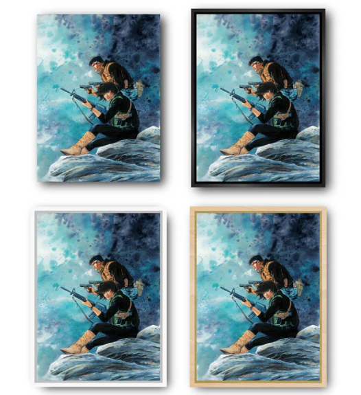 Onze Amerikaanse baklijsten in "L"-profiel worden met de hand in Frankrijk gemaakt van massief hout. Deze frames bieden een elegante esthetiek zonder af te leiden van het kunstwerk. Ze zijn verkrijgbaar in verschillende afwerkingen om te passen bij de sfeer van stripverhalen.