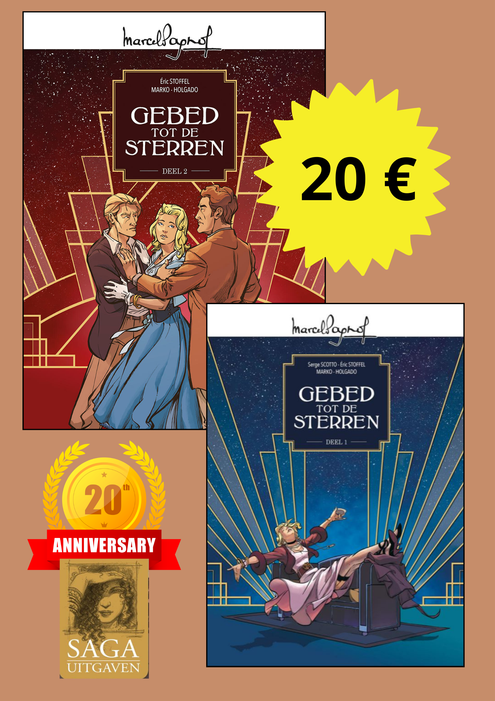 promopakket ter gelegenheid van 20 jaar bestaan van Saga Het tweeluik Gebed tot de Sterren is gebaseerd op een onvoltooide, vernietigde film van Marcel Pagnol om collaboratie tijdens de Tweede Wereldoorlog te voorkomen. Het romantische verhaal met weerhaken kent een dramatisch verloop. 'Dominique, een zakenman uit Lyon, is verliefd op Florence, een actrice in wording. Maar Dominique, die geconfronteerd wordt met de koppigheid van de vrouw met wie hij wil trouwen, onthult dat hij haar vorige films heeft gefinancierd om haar in staat te stellen haar hartstocht uit te leven en geeft aan dat hij geen verdere opnames zal betalen. Ontredderd door dit nieuws, maar vastberadener dan ooit, weigert Florence Dominiques huwelijksaanzoek. Dan ontmoet ze Pierre, een jonge muzikant. Ze wordt op slag verliefd op hem en vlucht met hem naar Cassis.'