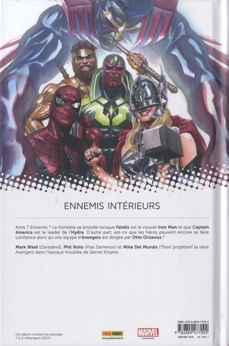 Amis ? Ennemis ? La frontière se brouille lorsque Fatalis est le nouvel Iron Man et que Captain America est le leader de l'Hydra. D'autre part, est-ce que tes héros peuvent encore se faire confiance alors qu'une équipe d'Avengers est dirigée par Otto Octavius ? Mark Waid (Daredevil). Phil Noto (Poe Dameron) et Mike Del Mundo (Thor) projettent la série Avengers dans l'époque troublée de Secret Empire.