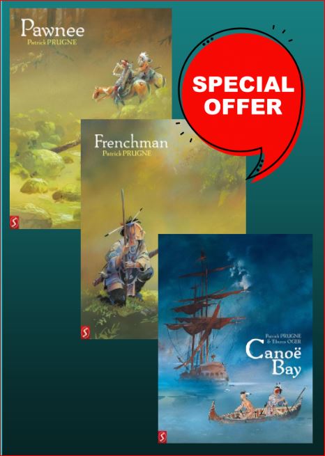er bestaat een promopakket met alle beschikbare boeken van Prugne Prugen promopakket Dit is VOORDEELPAKKET C en bevat: - Frenchman (+stofomslag) - Pawnee (+stofomslag) - Canoë Bay (+stofomslag) - kunstdruk (Zolang de voorraad strekt OP=OP) Tegen de historische achtergrond van de verovering van het Wilde Westen schetst Patrick Prugne een indringende en bewogen reis doorheen de uitgestrekte binnenlanden van Noord-Amerika. Frenchman en Pawnee vormen samen een compleet verhaal. Beide boeken zijn ook verkrijgbaar als gelimiteerde Collectors Editions: