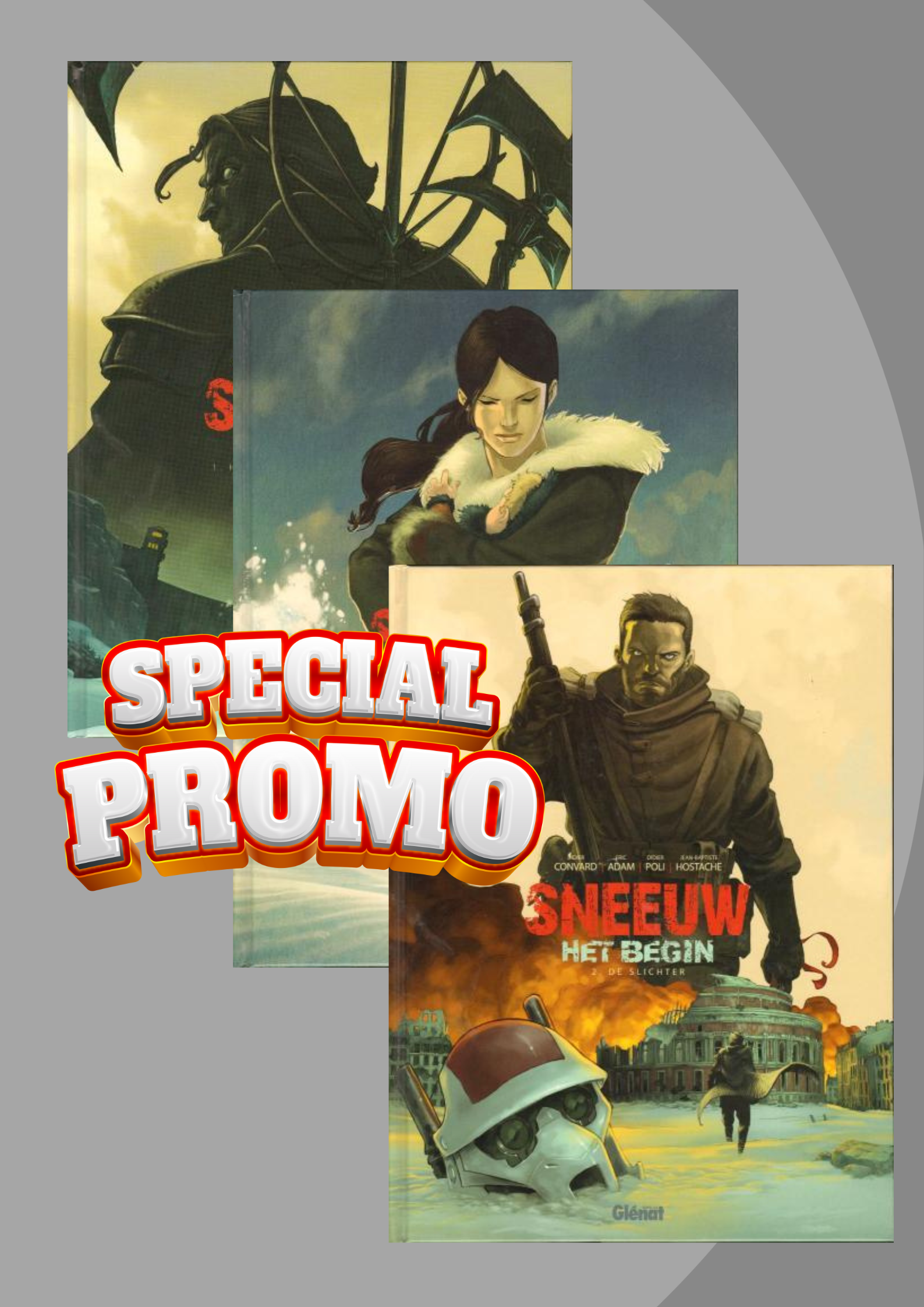 Promopakket hardcover 1 tot 3 Het bloed der onschuldigen is het eerste deel van de prequel van de cultstrip Sneeuw. Deze reeks van Didier Convard en Christian Gine gaf in de jaren tachtig een nieuwe draai aan de sciencefictionstrip. Sneeuw, de held van deze grootse ecologische saga, behield echter zijn duistere kant ... Elke zoektocht heeft zijn wortels, en die van het kind zonder geheugen werden al voor zijn geboorte in bloed gedoopt ... Met de diepmenselijke toets die we van Didier Convard kennen, en de poëzie van zijn coauteur Éric Adam geeft Sneeuw een haarscherpe en meedogenloze kijk op de mens die zich onder extreme omstandigheden moet zien te handhaven. Didier Poli en Jean-Baptiste Hostache brengen het verhaal op virtuoze en expressieve wijze in beeld. Sneeuw - Het begin, de oorsprong van een legende.