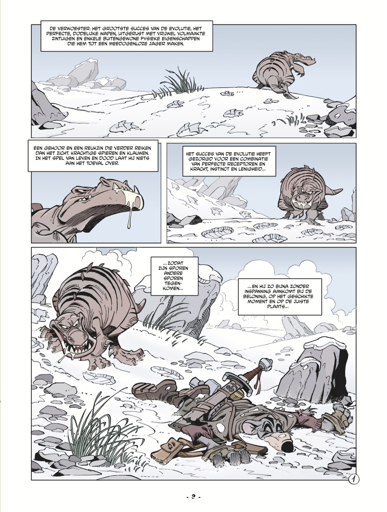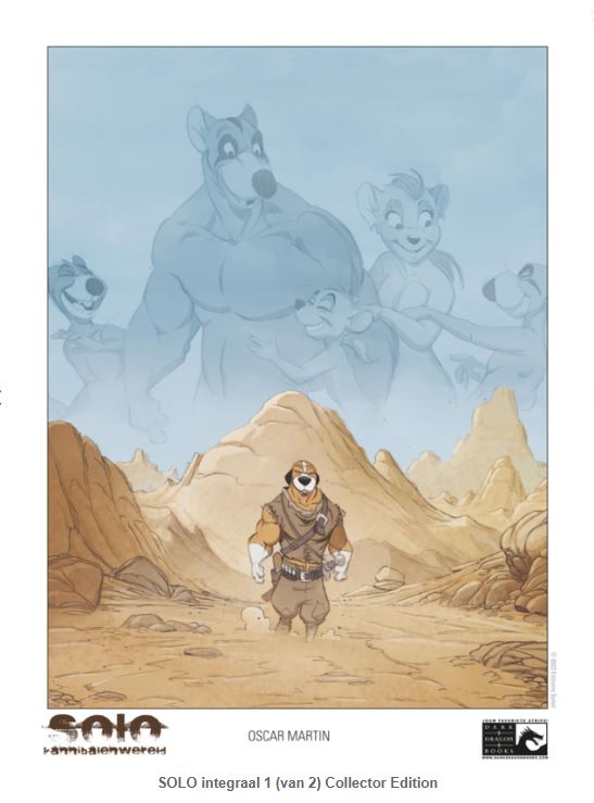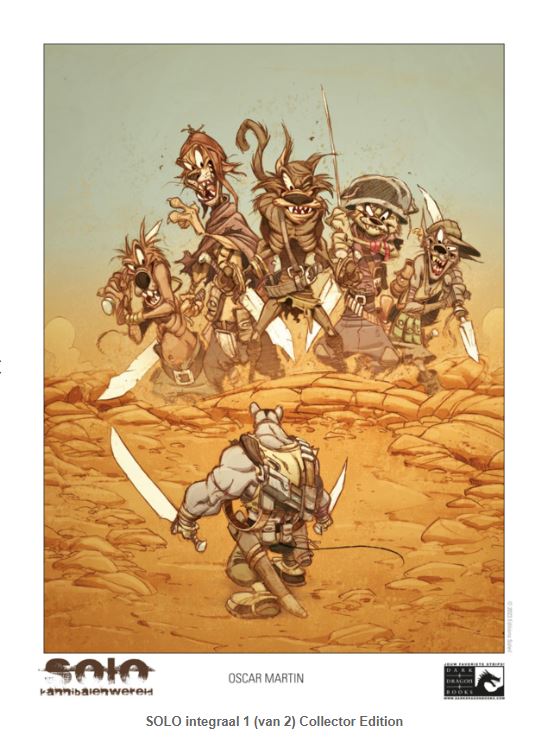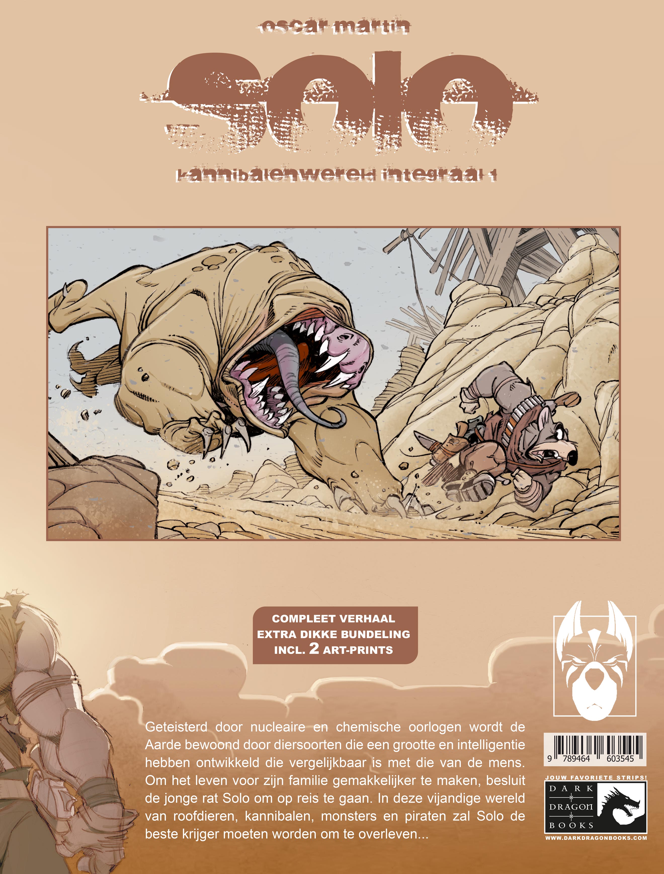sleeve & 2 art-prints Geteisterd door nucleaire en chemische oorlogen wordt de Aarde bewoond door diersoorten die een grootte en intelligentie hebben ontwikkeld die vergelijkbaar is met die van de mens. Om het leven voor zijn familie gemakkelijker te maken, besluit de jonge rat Solo om op reis te gaan. In deze vijandige wereld van roofdieren, kannibalen, monsters en piraten zal Solo de beste krijger moeten worden om te overleven... Solo, Kannibalenwereld Integraal 1 (van 2) Tekst & tekeningen: Oscar Martin ISBN: 9789464603545 92 blz. incl. dossier