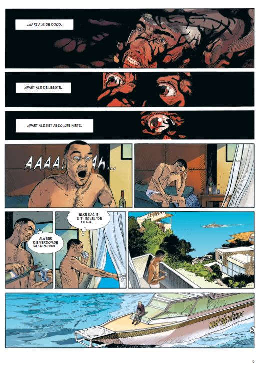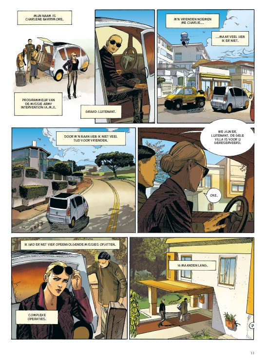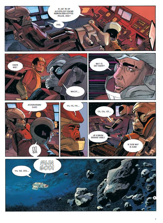 Gemiddelde score 3 / 5Geen magnum opus Het was puur toeval dat we deze strip lazen en een dag later in de bioscoop de nieuwe film van regisseur Roland Emmerich zagen. Want zowel in Moonfall als in deze strip is er sprake van een donkere materie in de ruimte die invloed heeft op een persoon. Verder zijn de overeenkomsten beperkt, maar dit gegeven viel ons wel op. Na deze ervaring werd astronaut John Bowman in quarantaine gezet en zijn carrière leek voorbij. Op zijn tropisch quarantaine-eiland krijgt hij gezelschap van programmeur en luitenant Charlene Barrymore. Na vier opeenvolgende missies mag ze gaan uitrusten. Haar rust is evenwel van korte duur. Ze leert John beter kennen en samen ontdekken ze dat hij bijzondere gaven heeft. Zo bijzonder dat hij de enige man is die de wereld kan redden van de ondergang. Bovenstaand in een one-shot klinkt als een uitdaging en in zijn voorwoord vermeldt Leo dat hij in eerste instantie ook geen voorstander was van dit idee. Oplettende lezers was de namen van het duo Bertrand Marchal en Rodolphe al opgevallen. Behalve het voorwoord heeft Leo geen verdere inbreng gehad in dit verhaal, het is een uitstapje van diens kompanen met wie hij de reeksen Kenya, Namibia, Amazonia en nu Scotland maakt. De tekenstijl van Marchal kunnen we zeker waarderen, maar zoals vaker is er enig verval in grafische kwaliteit. Het tekenen van ruimteschepen gaat hem beter af dan gelaatsuitdrukkingen. Voor de fans van het genre zeker een leuke strip, maar hun magnum opus is het niet. (Bron SSZ)