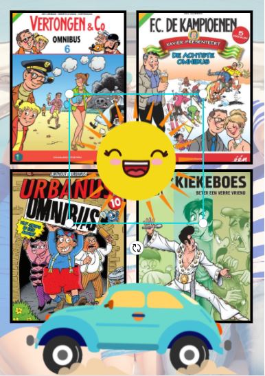Vier dikke omnibus strips met 18 strips meer dan 600 blz stripplezier voor op reis of thuis tijdens de vakantie te lezen. 5 verhalen van Urbanus : In deze omnibus lees je volgende verhalen: Urbanus zijn snippelepipke rekt uit (46), De harem van Urbanus (47), De tirannie van Eufrazie (48), Nabuko Donosor loopt voor de voeten (49), De hete Urbanus (50). 3 Kiekeboes verhalen : Eindelijk krijgt Leon Van Der Neffe de erkenning waarop hij al jaren wacht: een eigen verzamelalbum! Hierin 'schittert' hij maar liefst drie keer. Als sergeant in Geeeeef acht! Als bedrogen echtgenoot in En in kwade dagen. Als Elvis in Boek.bv. 5 verhalen van De Kampioenen : 36. De trouwpartij 37. Kampioenen op latten 38. Buffalo Boma 39. De vliegende reporter 40. De groene zwaan 5 verhalen van Vertongen & C° : Deze vijf avonturen van Markske, Paulientje, Oma Boma en inspecteur Porei zijn nu gebundeld in een omnibus. Voor extra lang leesplezier! In deze omnibus: Formule H2O bis (26), Kapitein Mark (27), De huwelijksreis van Bieke (28), Gewichtige zaken (29), Duel aan de top (30).