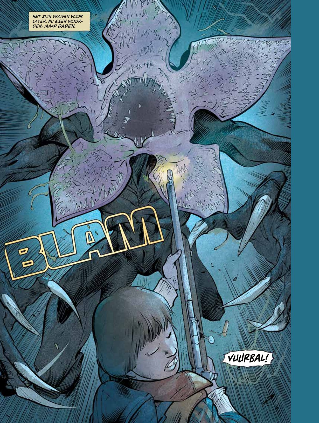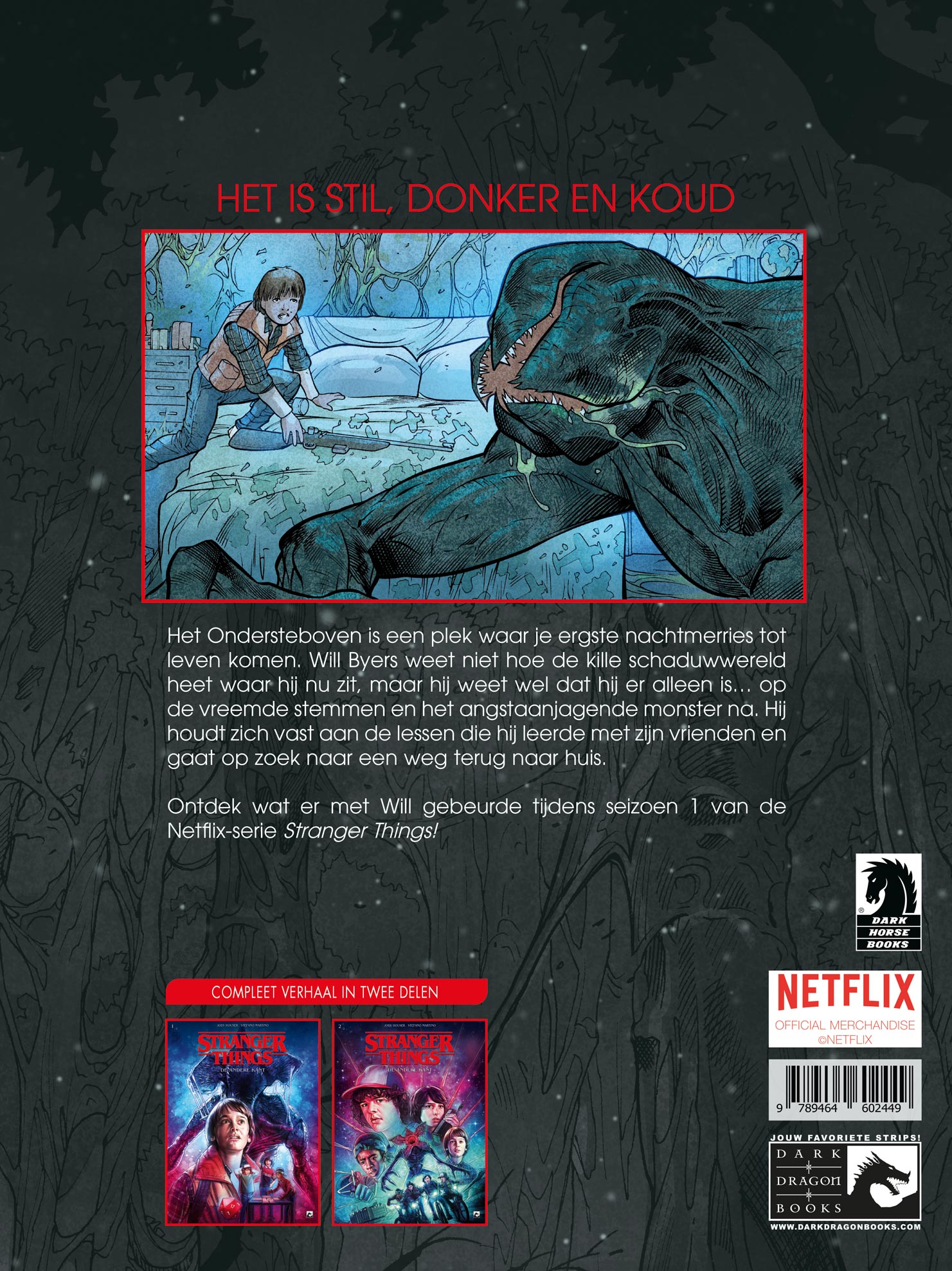 The Upside Down, is een plaats die je normaal ziet in paranormale visioenen en nachtmerries. Will Byers weet niet hoe hij het schimmige rijk waarin hij zich bevindt moet noemen, maar hij weet wel zeker dat hij alleen is en ver weg van alles wat ook maar enigszins veilig is. Om elke hoek loert een vreemd krijsend monster en vanaf de andere kant zweven bekende stemmen door de lucht. Om te overleven, houdt Will vast aan de lessen die hij heeft geleerd va de kameraadschap met zijn vrienden. Hij hoopt dat hij ooit terug naar zijn familie kan. Ontdek wat er met Will gebeurde tijdens de gebeurtenissen van seizoen 1 van de populaire Netflix-serie STRANGER THINGS. Stranger Things 1: De andere kant 1 (van 2) Tekst: Jody Hauser Orakel, Wouden van Opaal, Meester Inquisiteurs Tekeningen: Stefano Martino Doctor Who, Angel seizoen 6