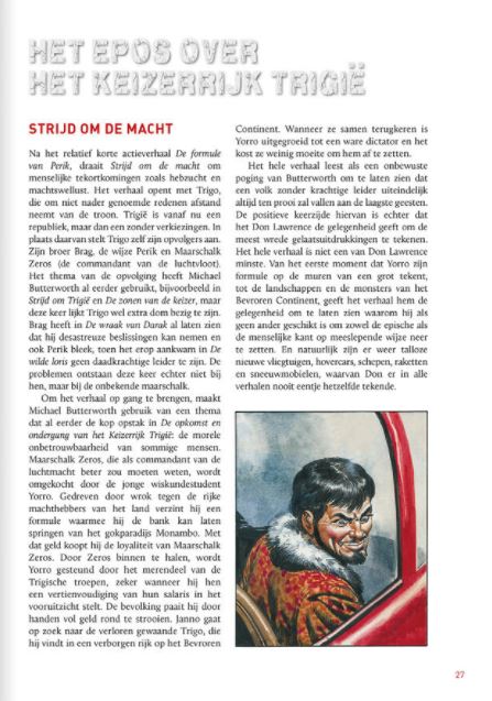 Trigo is al geruime tijd keizer van het Trigische rijk als er drie nazaten worden geboren, waardoor hij voor een onmenselijk groot dilemma komt te staan. Dit is slechts een van de vele problemen waar de moedige keizer, samen met de geleerde Perik en de jonge piloten Janno, Roffa en Keren weerstand aan moet bieden. Want of het nu buitenaardse veroveraars zijn, gemanipuleerde dictators of een reis om de planeet ruimtereiziger, iedere keer moeten ze tot het uiterste gaan om het voortbestaan van het rijk en soms zelfs de hele planeet te garanderen. In dit album zijn, naast een uitgebreid dossier over het ontstaan van de reeks, ook de verhalen De strijd om de macht, De rode dood, De valse keizer, De vijf opdrachten van Trigo en Dreiging uit het heelal opgenomen. Deze uitgave werd gereproduceerd vanaf de originele schilderijen, drukfilms en publicaties uit de jaren 60-70. Strijd om de Macht (24 pagina's uit 1969) De Rode Dood (18 pagina's uit 1970) De Valse Keizer (28 pagina's uit 1970) De Vijf Opdrachten van Trigo / Dreiging uit het Heelal (70 pagina's uit 1970-1971)