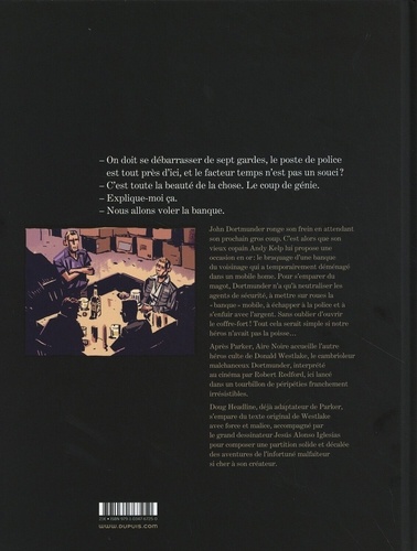 John Dortmunder ronge son frein en attendant son prochain gros coup. C'est alors que son vieux copain Andy Kelp lui propose une occasion en or : le braquage d'une banque du voisinage qui a temporairement déménagé dans un mobile home. Pour s'emparer du magot, Dortmunder n'a qu'à neutraliser les agents de sécurité, à mettre sur roues la " banque " mobile, à échapper à la police et à s'enfuir avec l'argent. Sans oublier d'ouvrir le coffre-fort ! Tout cela serait simple si notre héros n'avait pas la poisse... Après Parker, Aire Noire accueille l'autre héros culte de Donald Westlake, le cambrioleur malchanceux Dortmunder, interprété au cinéma par Robert Redford, ici lancé dans un tourbillon de péripéties franchement irrésistibles. Doug Headline, déjà adaptateur de Parker, s'empare du texte original de Westlake avec force et malice, accompagné par le grand dessinateur Jesus Alonso Iglesias pour composer une partition solide et décalée des aventures de l'infortuné malfaiteur si cher à son créateur.
