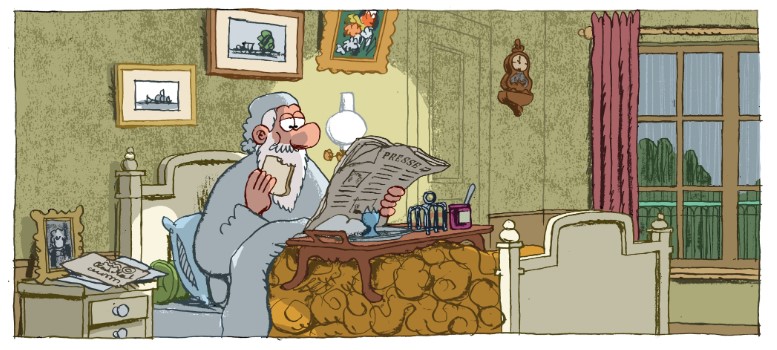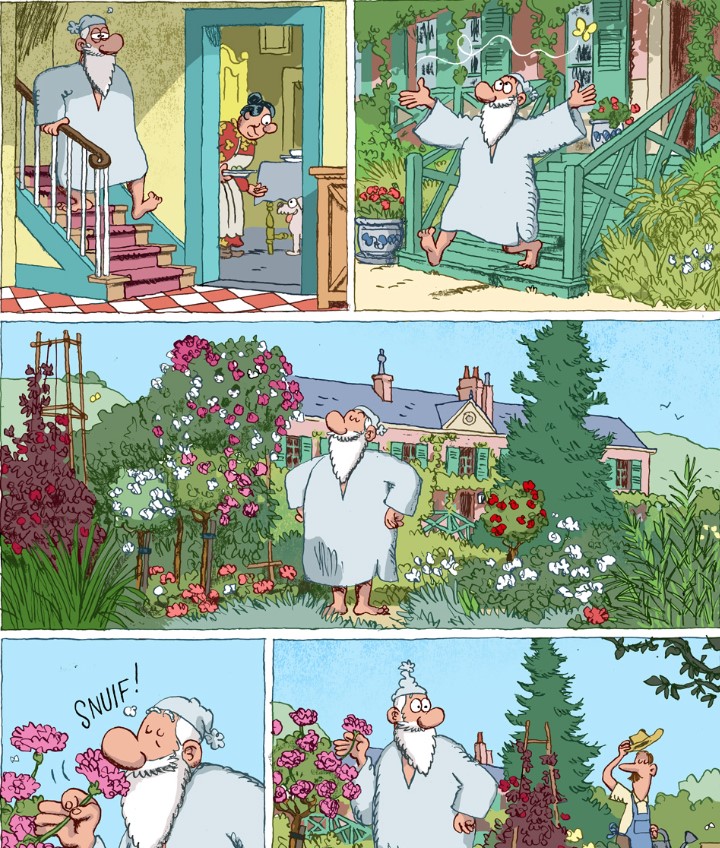 Deel 2 brengt ons naar het landelijke dorpje Giverny, aan de oevers van de Seine en de Epte, waar Monet zich in 1870 vestigde. Nu hij eindelijk uit zijn geldzorgen is, kan hij zich concentreren op zijn tuin en de nabije omgeving. Monet leeft mee met de grillen van de natuur en probeert als een bezetene alle veranderende natuurfenomenen vast te leggen. Hij schildert onophoudelijk, soms wel vijf doeken tegelijkertijd. Claude Monet werkt het liefst vanuit zijn studioboot, waar hij niet gestoord wordt. Hij houdt van wolken, mist en ochtenddauw, maar als het dagenlang regent blijft hij gewoon in bed liggen. Als een schilderij hem achteraf niet bevalt, breekt hij het in stukken en stookt het op, tot grote ergernis van zijn kunsthandelaar. Net zoals deel 1 “Etretat” bestaat de strip uit 44 pagina’s en een geillustreerd dossier met allerlei specifieke Monet weetjes. In totaal zijn er 3 delen voorzien. Het derde deel zou voor 2026 moeten verschijnen. Dan is het exact 100 jaar geleden dat Monet is overleden. Elk deel kan afzonderlijk gelezen worden. De strip zelf is volledig tekstloos.