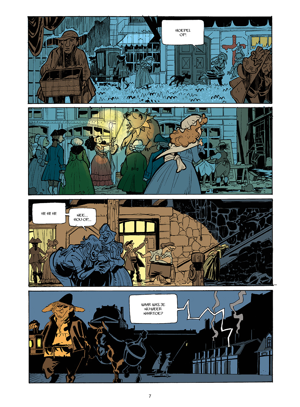 De stevige inkleuring weegt zwaar op het geheel. Vaak overheerst één kleur per pagina, wat de lijnvoering onderdrukt en de sfeer verstikt. De monochrome tinten zijn wellicht bedoeld om nuance te scheppen, maar camoufleren tegelijk de kwaliteiten van het tekenwerk en maken het soms zelfs plat.