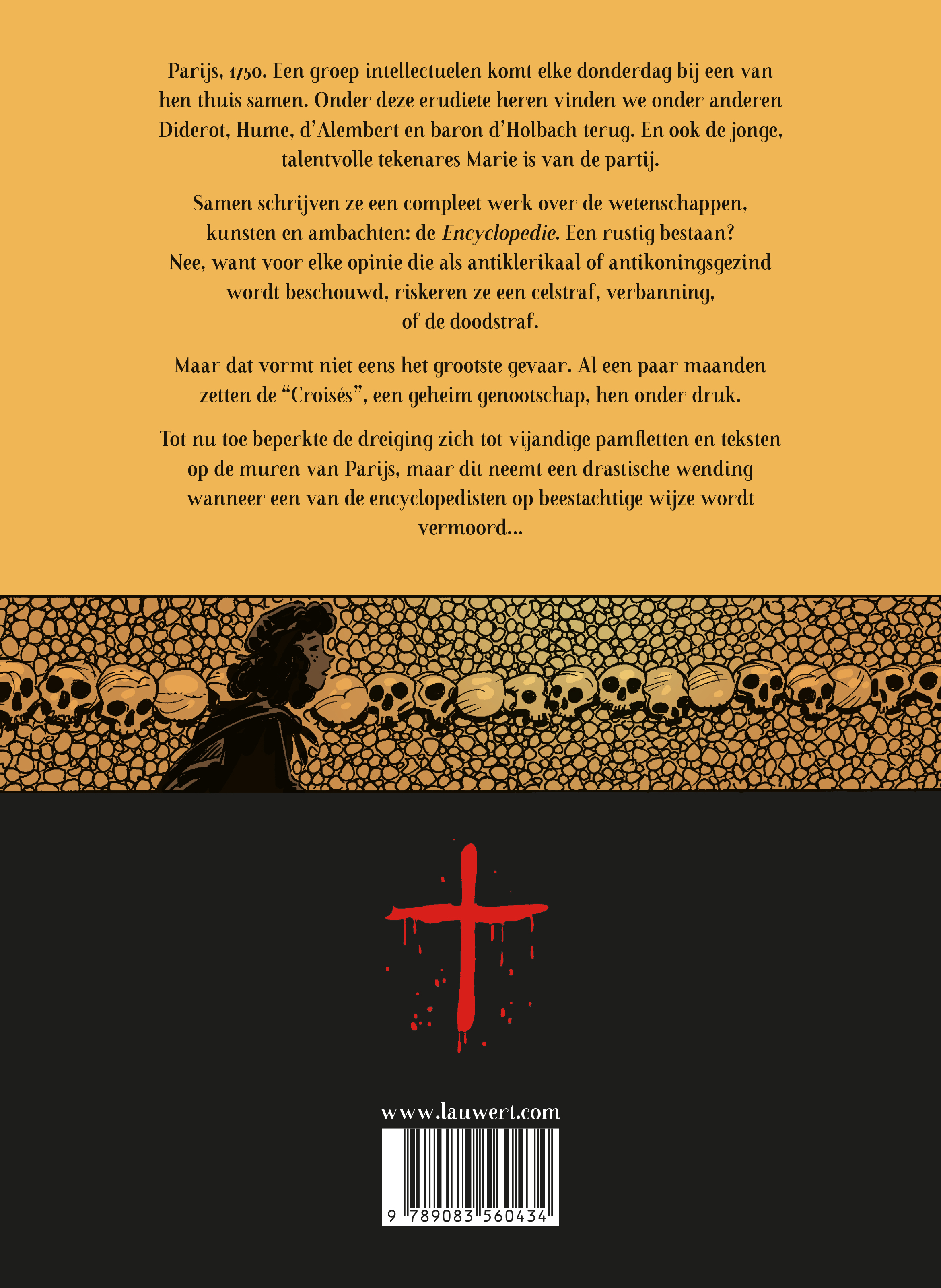 Parijs, 1750. Een groep intellectuelen komt elke donderdag bij een van hen thuis samen. Onder deze erudiete heren vinden we onder anderen Diderot, Hume, d’Alembert en baron d’Holbach terug. En ook de jonge, talentvolle tekenares Marie is van de partij. Samen schrijven ze een compleet werk over de wetenschappen, kunsten en ambachten: de Encyclopedie. Een rustig bestaan? Nee, want voor elke opinie die als antiklerikaal of antikoningsgezind wordt beschouwd, riskeren ze een celstraf, verbanning, of de doodstraf. Maar dat vormt niet eens het grootste gevaar. Al een paar maanden zetten de “Croisés”, een geheim genootschap, hen onder druk. Tot nu toe beperkte de dreiging zich tot vijandige pamfletten en teksten op de muren van Parijs, maar dit neemt een drastische wending wanneer een van de encyclopedisten op beestachtige wijze wordt vermoord...