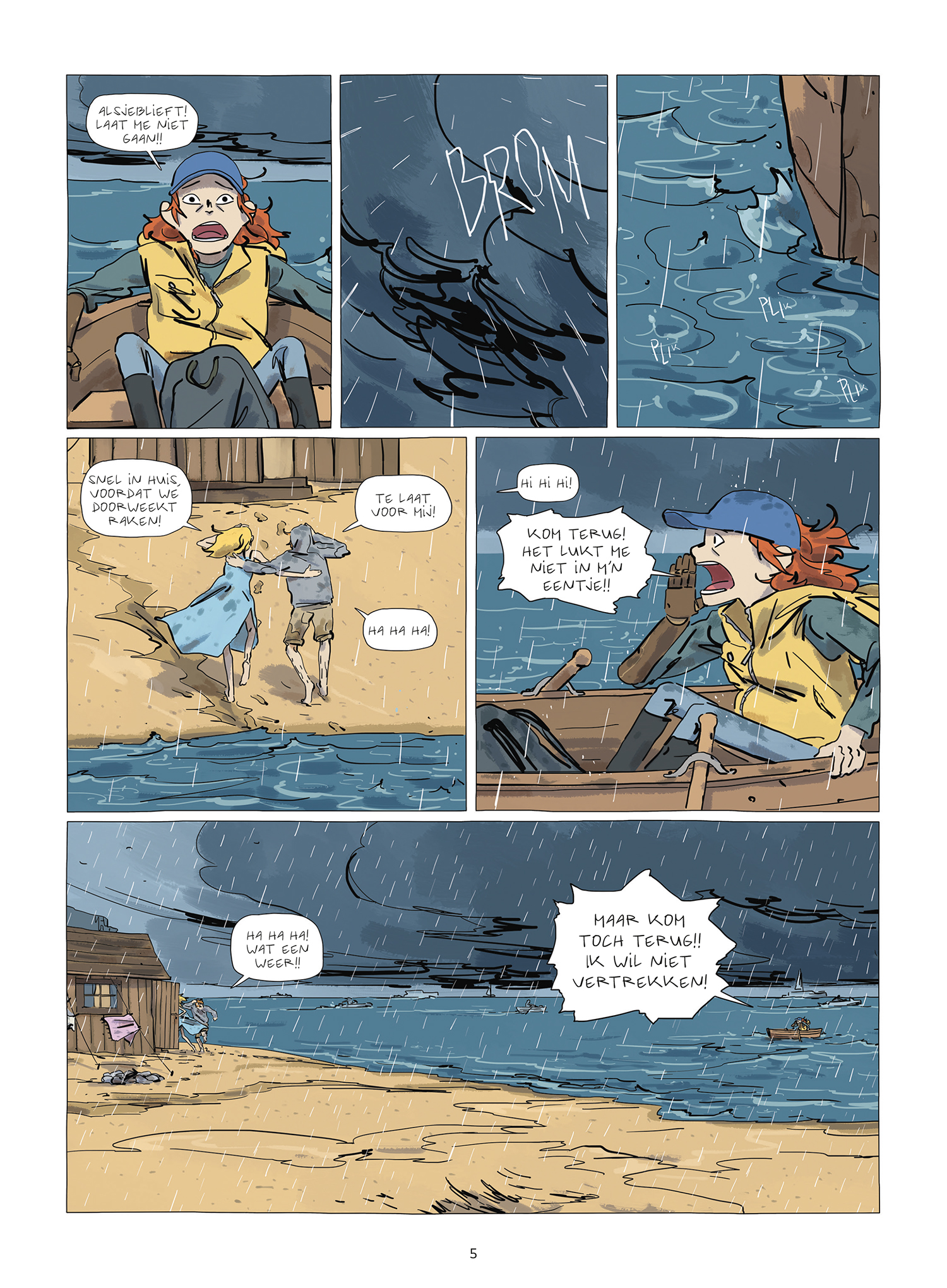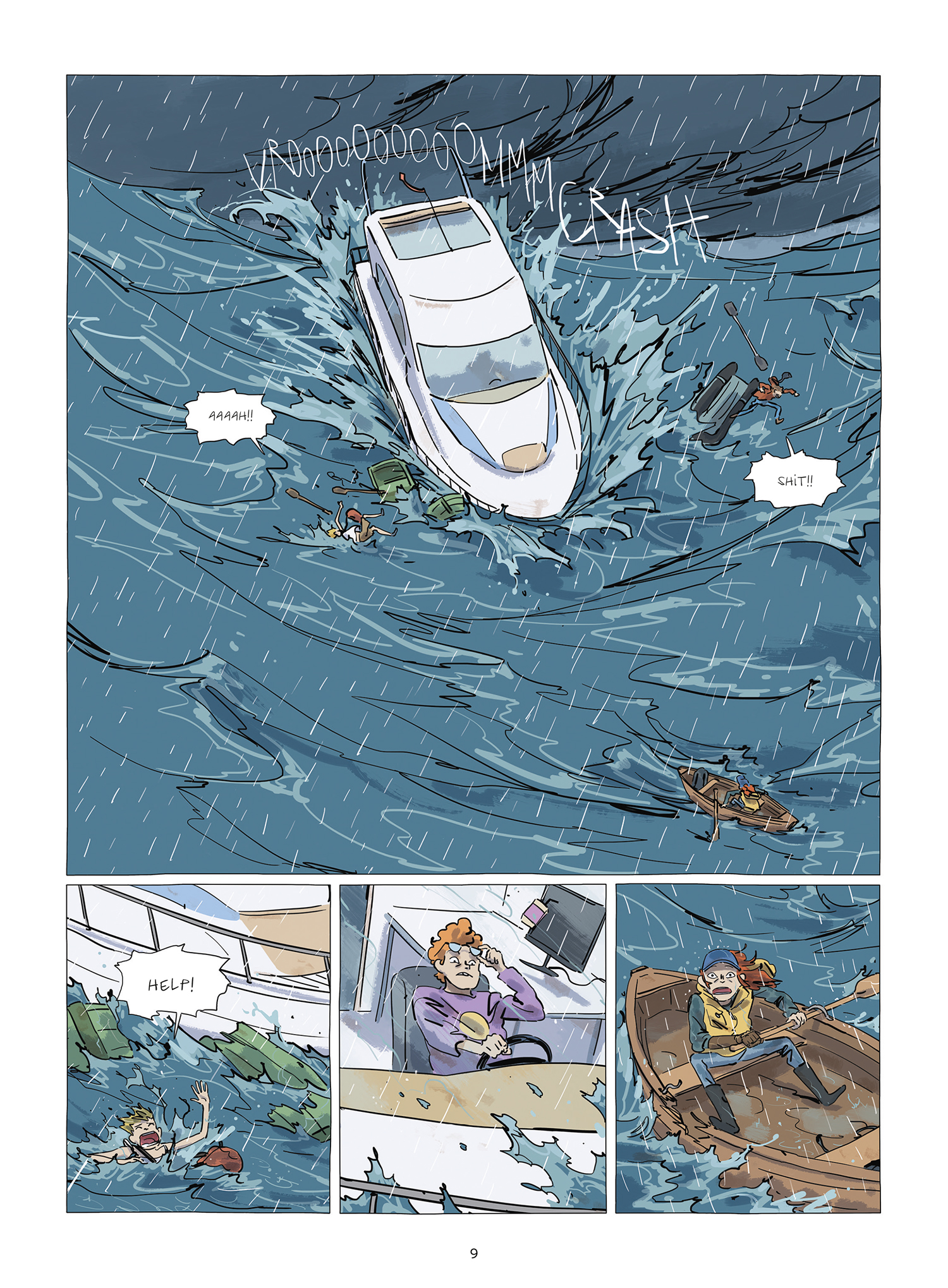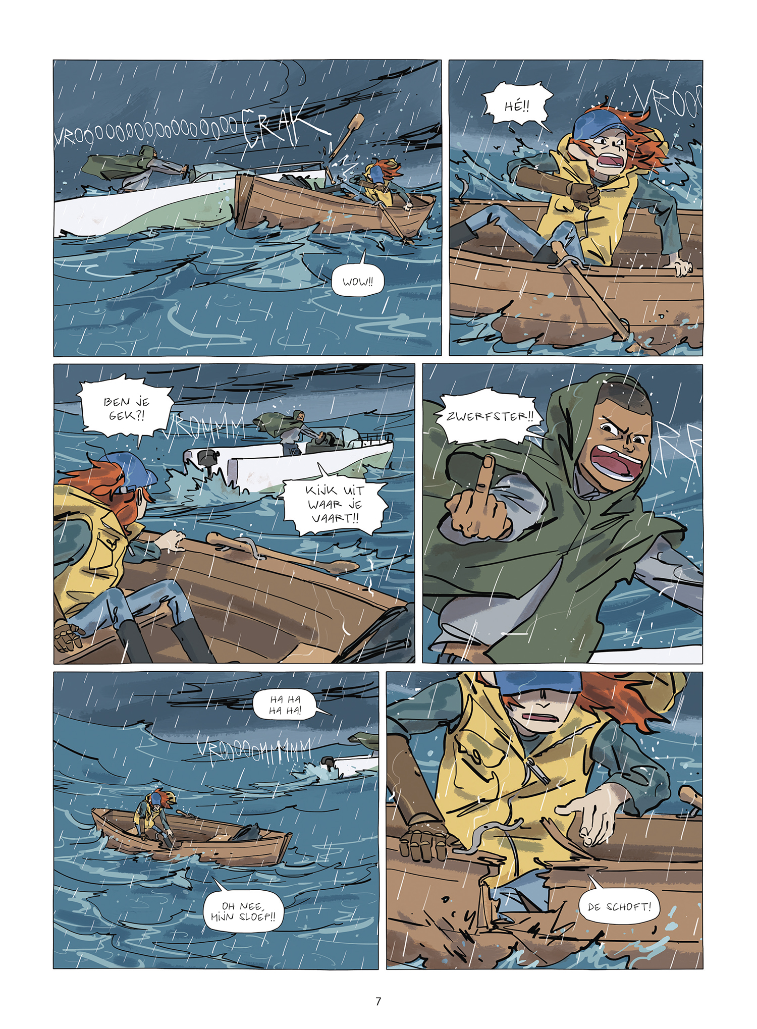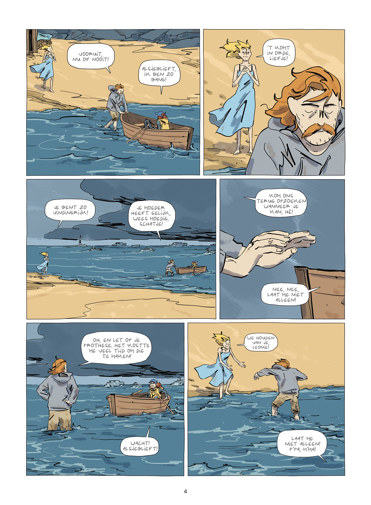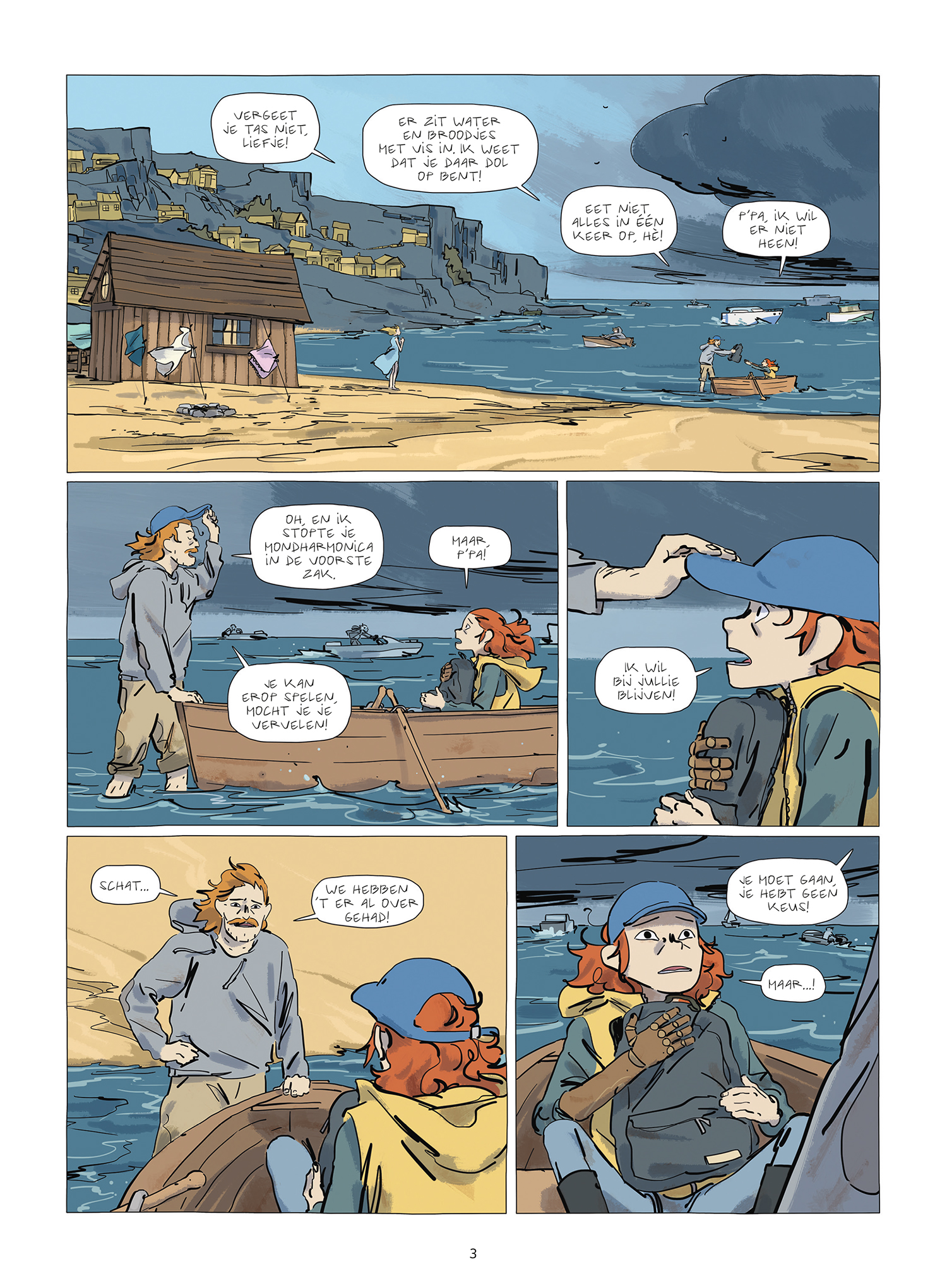 Met een beetje voorkennis ga je dit verhaal meer waarderen: het is een metafoor voor de overgang van kind naar volwassene. De eerste pagina's geven dit weer door middel van de ouders die hun kind met een bootje de open zee opsturen. De rest van het verhaal beschrijft de moeilijkheden, maar ook de leuke zaken, waar je mee te maken krijgt in je tocht naar volwassenheid. Hoewel het verhaal door de tekeningen, inkleuring en de jonge leeftijd van het hoofdpersonage zacht aandoet, is het eigenlijk heel hard. Geweld en dood komen regelmatig aan bod en de gruwel ervan wordt onverbloemd getoond. Ik geef het drie sterren omdat de orignaliteit van het verhaal te wensen overlaat. Ondanks een paar leuke vondsten (een jongen die niet kan spreken geluid laten maken met een mondharmonica) zijn de gebeurtenissen een beetje afgezaagd. Het hele verhaal lijkt trouwens ook sterk op dat van de film 'Waterworld': een zoektocht naar het vaste land en piraten met als hoodfkwartier een pakketboot.