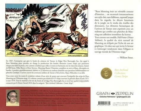 En 1967, l'entreprise qui gère le fonds du créateur de Tarzan, la Edgar Rice Burroughs Inc, fair appel à Russ Manning pour prendre en charge la production des bandes dessinées (comic strips) qui paraissent chaque jour dans la presse, avec comme condition que celles-ci soient en harmonie avec la vision du créateur. Assisté de Bill Stout, Mike Royer et Dave Stevens, Manning illustre 9 histoires complètes en noir et blanc, découpées en bandes, à paraître quotidiennement (dailies) et 22 histoires en couleurs destinées aux parutions hebdomadaires en planches (sundays). l'action couvre les aventures inédites de Tarzan à Pal-al-don, Opar, Pellucidar et au-delà. Vous tenez entre les mains le troisième volume d'une série de quatre qui couvrent l'intégralité des strips de Russ Manning sur l'Homme-singe. Ce volume contient pas moins de 475 strips couvrant la période allant d'août 1971 à mars 1974. Tout le matériel a été tiré du fonds de la Edgar Rice Burroughs Inc et est d'une qualité irréprochable consacrée par le Eisner Award 2014 dans la catégorie "Best Archival Collection : Comic Strips".