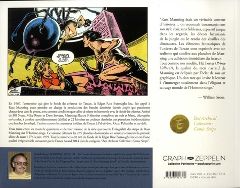 Russ Manning qui s'est illustré en produisant les adaptations en BD des romans d'Edgar Rice Burroughs se voit confier la création des pages de Tarzan qui paraissent chaque jour dans la presse depuis 1929, avec comme condition que celles-ci soient en harmonie avec la vision du créateur. Assisté de Bill Stout, Mike Royer et Dave Stevens, Manning illustre 9 histoires complètes en N&B et 22 histoires en couleurs. L'action couvre l'ensemble des mondes créés par Burroughs : Afrique équatoriale et saharienne pleine de mystère, les mondes perdus de Pal-ul-don, Opar la cité atlante oubliée, Pellucidar le monde au creux de la Terre, Xuja la cité des fous... Avec son dessin, Russ Manning a su produire les plus grandes adaptations de Tarzan en BD. Tout ce matériel a été tiré du fonds de la Edgar Rice Burroughs Inc et est d'une qualité irréprochable, consacrée par le Eisner Award. Ce volume, accessible à toutes les bourses, couvre la période 1974-1979 et représente 9 aventures complètes.