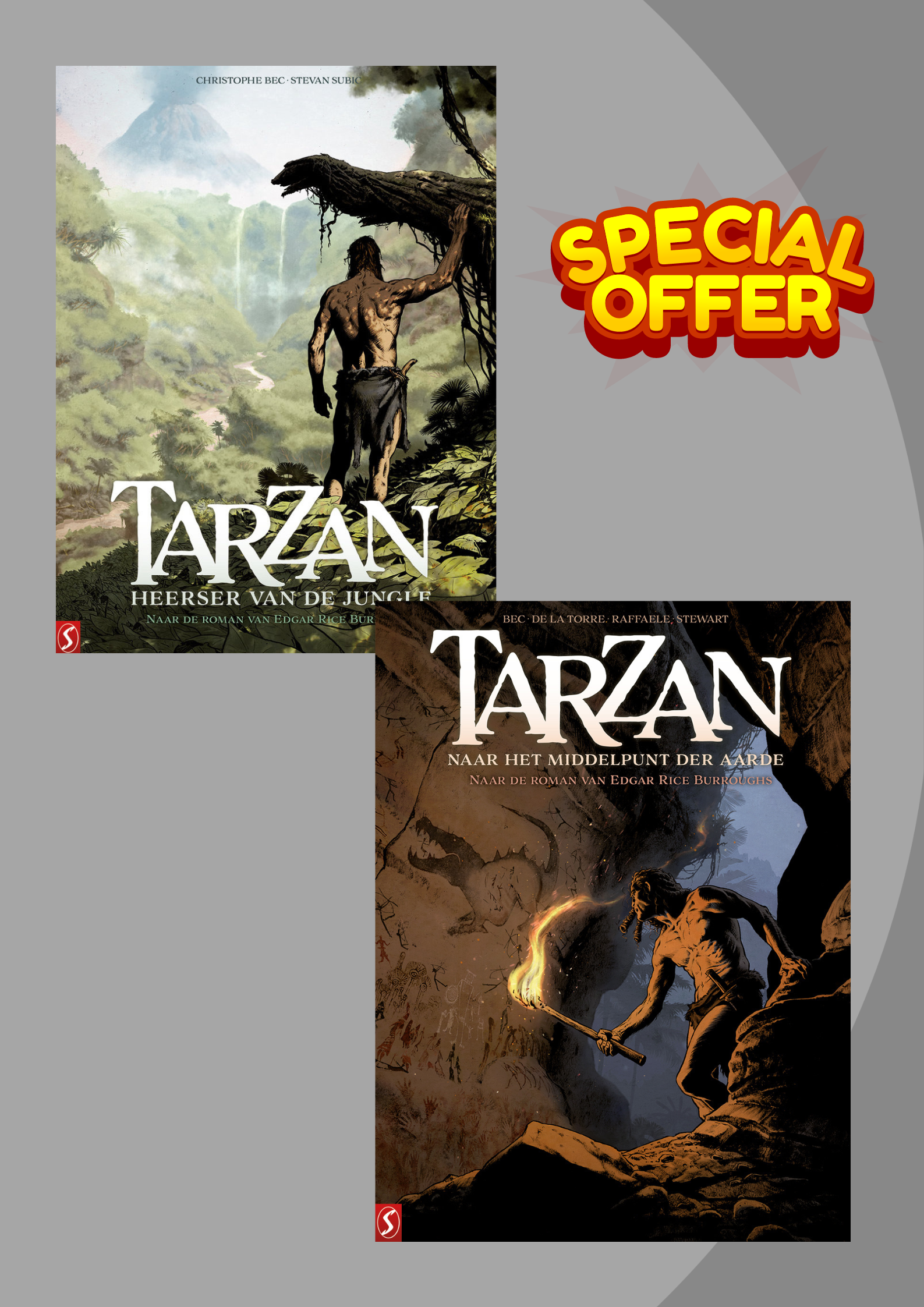 Dit voordeelpakket bevat hardcover 1 en 2 van Tarzan: 1 - Heer van de jungle 2 - Naar het middelpunt der aarde Een buitengewoon avontuur voor de held van Edgar Rice Burroughs, in de sfeer van de klassieke avonturenromannetjes! Negentiende eeuw. Lord John en Lady Alice Greystoke hebben Engeland verlaten en stranden na een schipbreuk op de kust van Equatoriaal Afrika. Niet veel later bevalt Alice van een zoontje. Die wordt na de dood van zijn ouders opgevoed door een groep apen. De jonge Tarzan zal verscheurd worden tussen het harde leven in de wildernis en zijn Britse aristocratische afkomst… ----------------------- Een buitengewoon avontuur voor de held van Edgar Rice Burroughs, in de sfeer van de klassieke avonturenromannetjes, dat hem naar het binnenste der aarde zal leiden! Tarzan vertrekt op expeditie naar de legendarische stad Opar en zijn schatten en beleeft een van zijn spannendste avonturen, dat hem aan boord van een zeppelin naar Pellucidar zal voeren, de holle aarde, een prehistorische onderaardse wereld vol gevaren waaruit hij misschien nooit heelhuids zal terugkeren. Een getrouwe bewerking van de sombere en gewelddadige debuutroman van de geniale Edgar Rice Burroughs. Negentiende eeuw. Lord John en Lady Alice Greystoke hebben Engeland verlaten en stranden na een schipbreuk op de kust van Equatoriaal Afrika. Niet veel later bevalt Alice van een zoontje. Die wordt na de dood van zijn ouders opgevoed door een groep apen. De jonge Tarzan zal verscheurd worden tussen het harde leven in de wildernis en zijn Britse aristocratische afkomst…