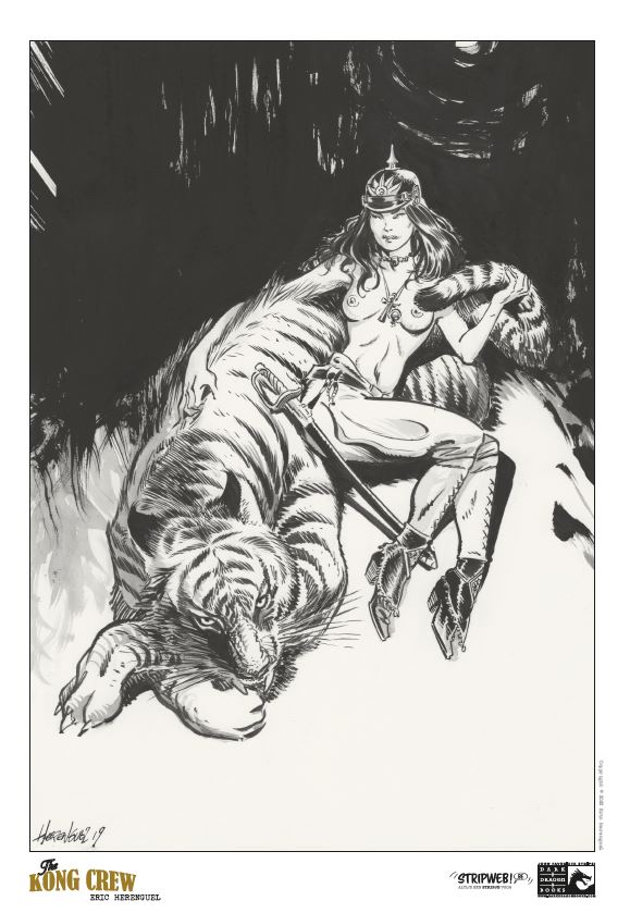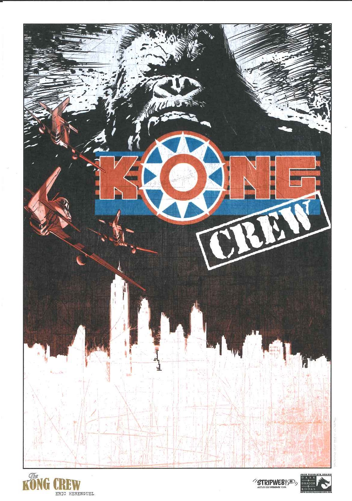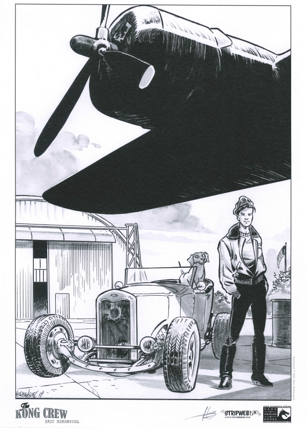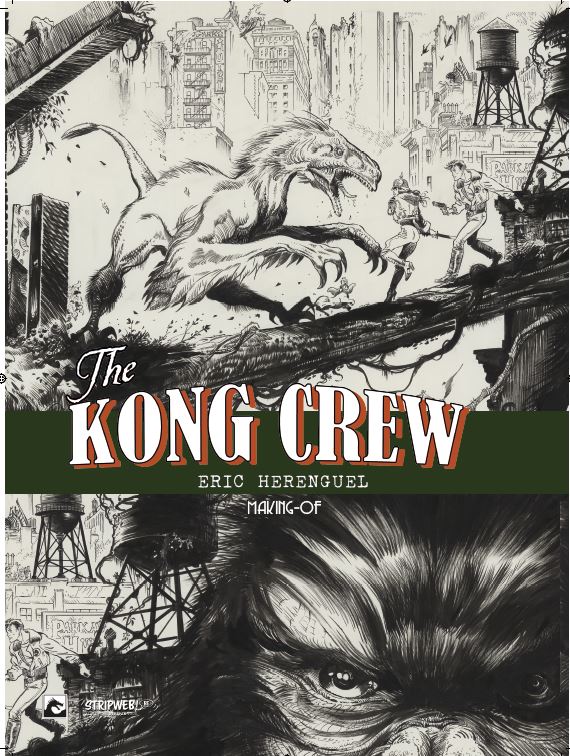 Kong Crew deel 1/3 Wat als Kong niet dood zou zijn en de strijd had gewonnen? 1947 Manahtten is een Jungle geworden die een verboden zone geworden, de bevolking is in allerijl geëvacueerd waarbij Kong er nu samen met een heleboel andere prehistorische dieren heerst. Er zit ook iets Vampierachtig in die Jungle, waar de vegetatie ook 2x zo snel groeit als normaal, die aan het muteren is die zal meer vorm krijgen op het einde van de reeks….. Manhatten Jungle wordt door het Amerikaans leger super goed beveiligd zodat er geen dieren naar buiten kunnen. Één van de piloten, Virgil die voor de observatie instond komt echter terecht in die zone op zoek naar 2 ontdekkingsreizigers. Hérenguel geeft hier duidelijk zijn interesse aan voor vliegtuigen ( zijn vader en broer waren piloot in de jaren ’60) en de vintage stijl van de jaren 40 zoals in de films van Frank Capra, de strips van Eisner, Frazetta, Wood,… . Het hoofdpersonage is een niet het type held die we kennen maar een eerder onhandige, piloot met wat communicatie problemen. De reden waarom Kong niet zo expliciet in beeld komt in dit eerste deel, vergelijkt Hérenguel met de film “ Alien” van Ridley Scott waarbij het niet veel in beeld brengen van Alien het personage meer angst uitstraalt. We zullen hem wel meer zien naar het einde van de reeks toe. Tevens is er een project hangende om de strip in tekenfilm uit te brengen in 12 afleveringen waarbij Amazon Prime Video of Netflix interesse hebben. De reden waarom men Kong gebruikt en niet King Kong is omdat deze naam auteursrechtelijk beschermd is. In ieder geval een strip om naar uit te kijken, met wat comics invloeden, vintage stijl, avontuur, dynamiek, romantiek, spanning, mooie amazones en een …. Tekel! Bij de luxe uitgave en gewone versie krijg je bij stripweb nog een mooie gesigneerd ex-libris bij, en dit helemaal gratis. Een zeer mooi uitgegeven strip door Dark Dragon Books die een echt pareltje is. Wat als Kong de strijd had gewonnen? Het is 1947, 14 jaar nadat Kong de overwinning behaalde. Manhattan is geëvacueerd en verklaard tot verboden zone. Op de naleving van deze regels wordt toezicht gehouden door 'The Kong Crew'. Dit zijn de avonturen van dit elite corps!