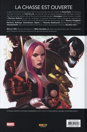 Les super-vilains à l'origine des Thunderbolts ont tout fait pour se racheter et être acceptés comme des héros à part entière, mais le monde refuse d'oublier leur passé criminel. Alors, au lendemain de la guerre civile qui a vu s'entredéchirer les plus grands héros Marvel, Songbird et les autres en ont assez : si l'Amérique a perdu foi en ses héros, il va falloir qu'elle fasse confiance à ses vilains ! Warren Ellis (Transmetropolitan) et Mike Deodato Jr (Original Sin) se réunissent pour apporter une nouvelle modernité au concept créé par Kurt Busiek. La saga n'avait pas été rééditée depuis dix ans, la sortie au cinéma de Thunderbolts est donc une bonne occasion pour redécouvrir cette excellente série (qui était aussi le prélude à la naissance des Dark Avengers, à la suite de Secret Invasion).