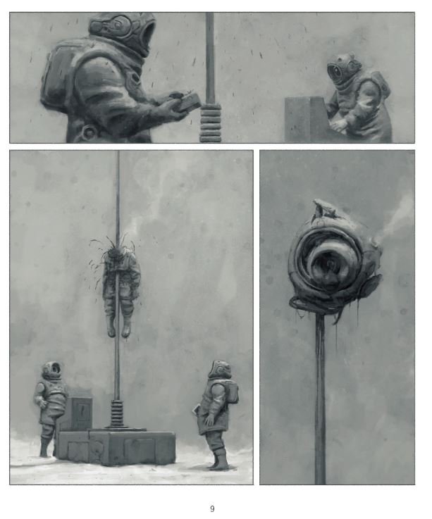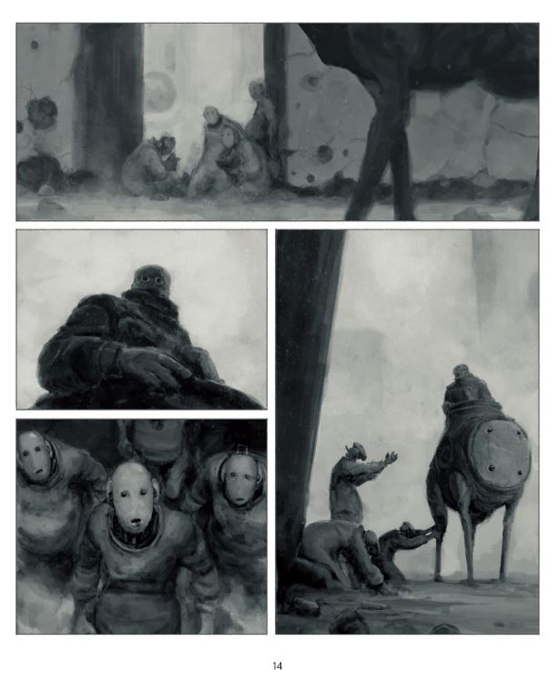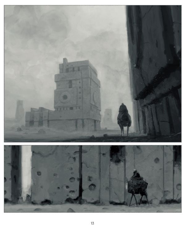 In dit indrukwekkende debuut schept de jonge Nederlandse Tekenaar Pim Bos een dystopische wereld vol grimmigheid en absurde humor. Geen tekst enkel Beelden. Een wereld van Wanhoop en Desillusie! Een strip die grafisch heel knap in elkaar zit en die blijft nazinderen. Het is met perfecte beheersing dat dit surrealistische, post-apocalyptische en stomme verhaal, met adembenemende graphics in de lijn van Arzach de Moebius, een diepe indruk wekt van eenzaamheid en melancholie door de dwaling van zijn karakter. Verhaal: In een grijze, futuristische en apocalyptische wereld dwalen een vreemde reiziger en zijn paard in verlaten gebieden. Gedwongen om hun energie op te laden, kunnen ze niet te lang wegblijven van de beschaving. Hoewel er andere wezens leven, is de stad net zo onherbergzaam, leeg en somber. Maar overal waar de reiziger passeert, gaat het mis, machines verliezen hun hoofd en zaaien chaos. Hij moet de stad verlaten en de uitgestrekte grijze gebieden opnieuw verkennen, alleen.