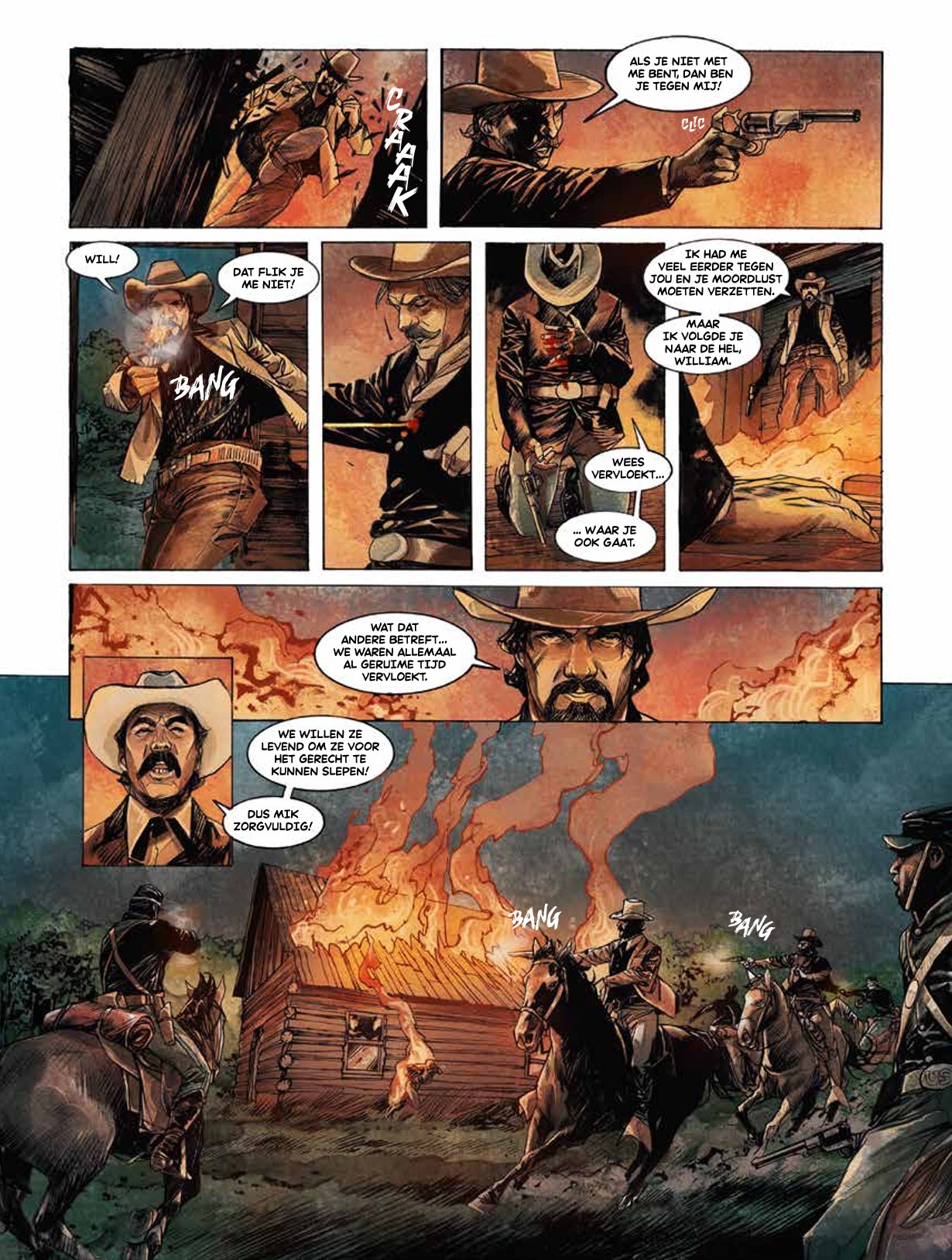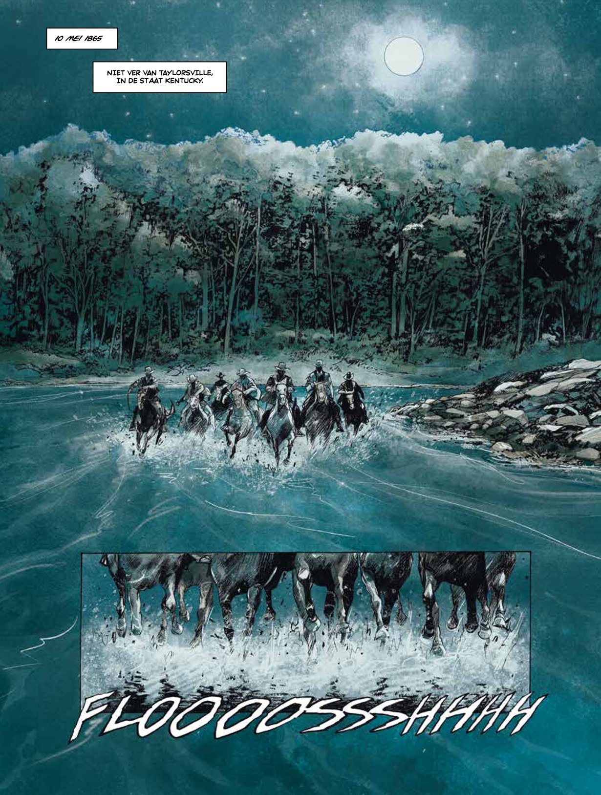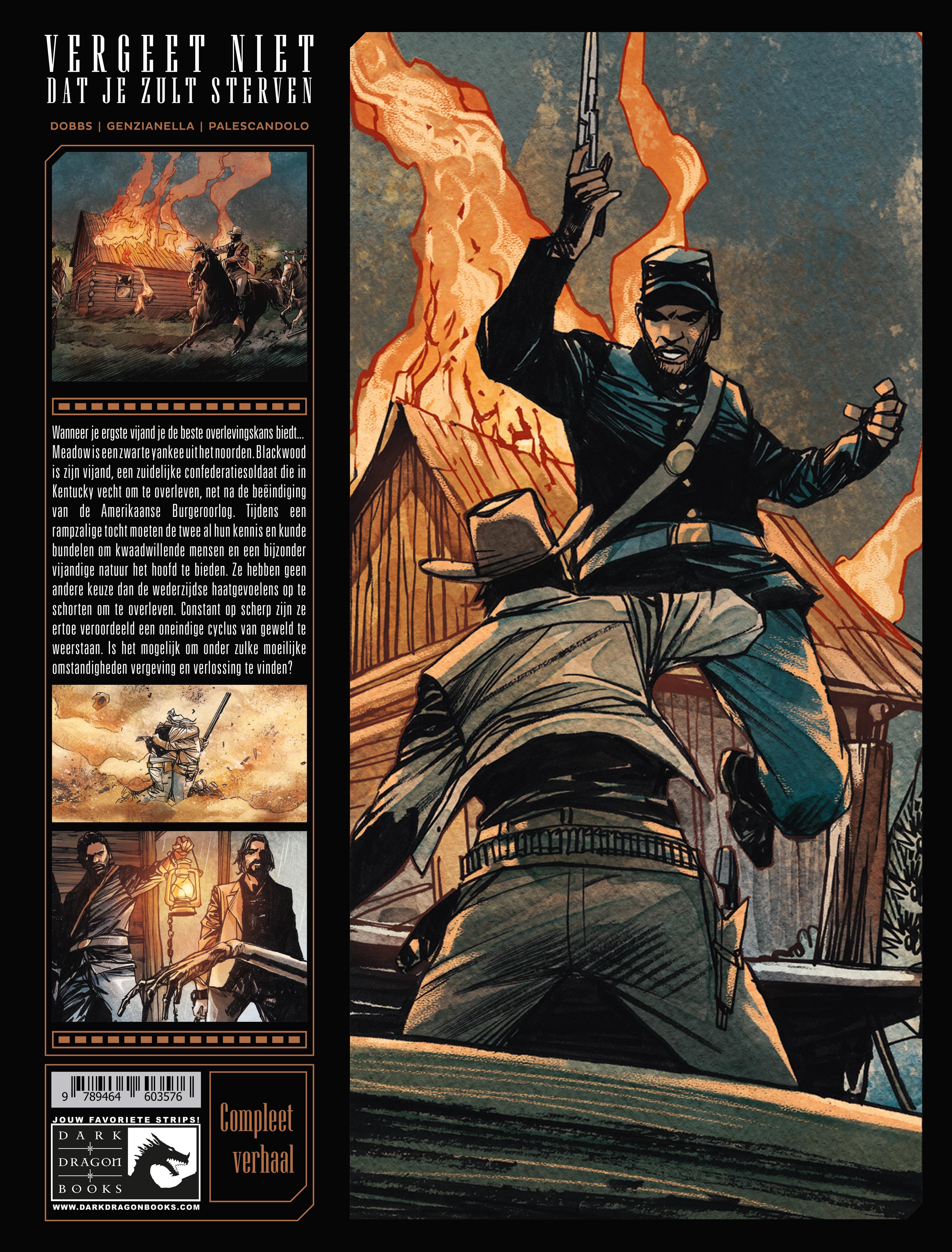 HIER BESTAAT OOK EEN EXCLUSIEVE STRIPWEBVERSIE VAN MET SPECIALE STOFOMSLAG EN EX LIBRIS GENUMMERD OP 75 EX Vergeet niet dat je zult sterven – stripwebversie Wanneer je ergste vijand je de beste overlevingskans biedt. Meadows, een zwarte yankee uit het noorden, en zijn vijand Blackwood, een confederatiesoldaat, vechten om te overleven in Kentucky net na de beëindiging van de Amerikaanse Burgeroorlog. Tijdens een rampzalige reis zullen ze al hun kennis en kunde moeten bundelen om menselijke tegenspoed en de bijzonder vijandige natuur het hoofd te bieden. Tussen haat en verlatenheid zullen ze geen andere keuze hebben dan hun wrok te overwinnen om te overleven. Maar hoe kunnen deze personages die constant op scherp staan ontsnappen aan de onveranderlijke cyclus van geweld? En hoe is het mogelijk om in zulke moeilijke omstandigheden vergeving en verlossing te vinden? Vergeet niet dat je zult sterven Tekst: Dobbs Het beest in de mens, Nicolas le Floch Tekeningen: Nicola Genzianella