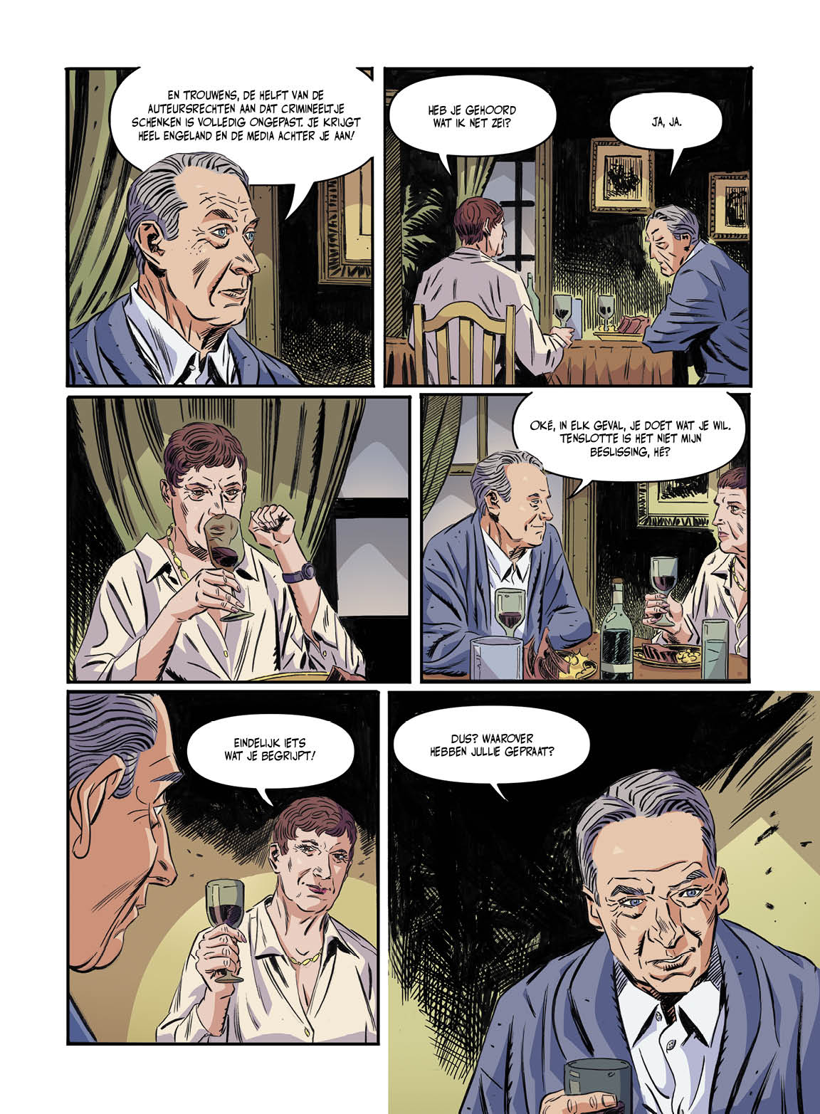 Op dat narratieve skelet zet Vanessa Belardo een sobere maar krachtige tekenstijl neer. Met een sterk geïnkt lijnenspel, gezichten die door spanning worden geboetseerd en blikken die meer zeggen dan dialogen, staat expressie centraal. De vaak donkere sfeer ondersteunt de lectuur en versterkt het gevoel van een steeds strakker wordende greep. De strenge, beheerste paginacompositie speelt met stilte en breuken en doet denken aan de doeltreffendheid van bepaalde Italiaanse tradities, onder meer die van samenwerkingen met Bonelli Editore. StefanoRonconi’s kleuren blijven bewust ingehouden: ze illustreren niet, maar sturen de atmosfeer, verankeren de tijd en verdichten de dreiging.
