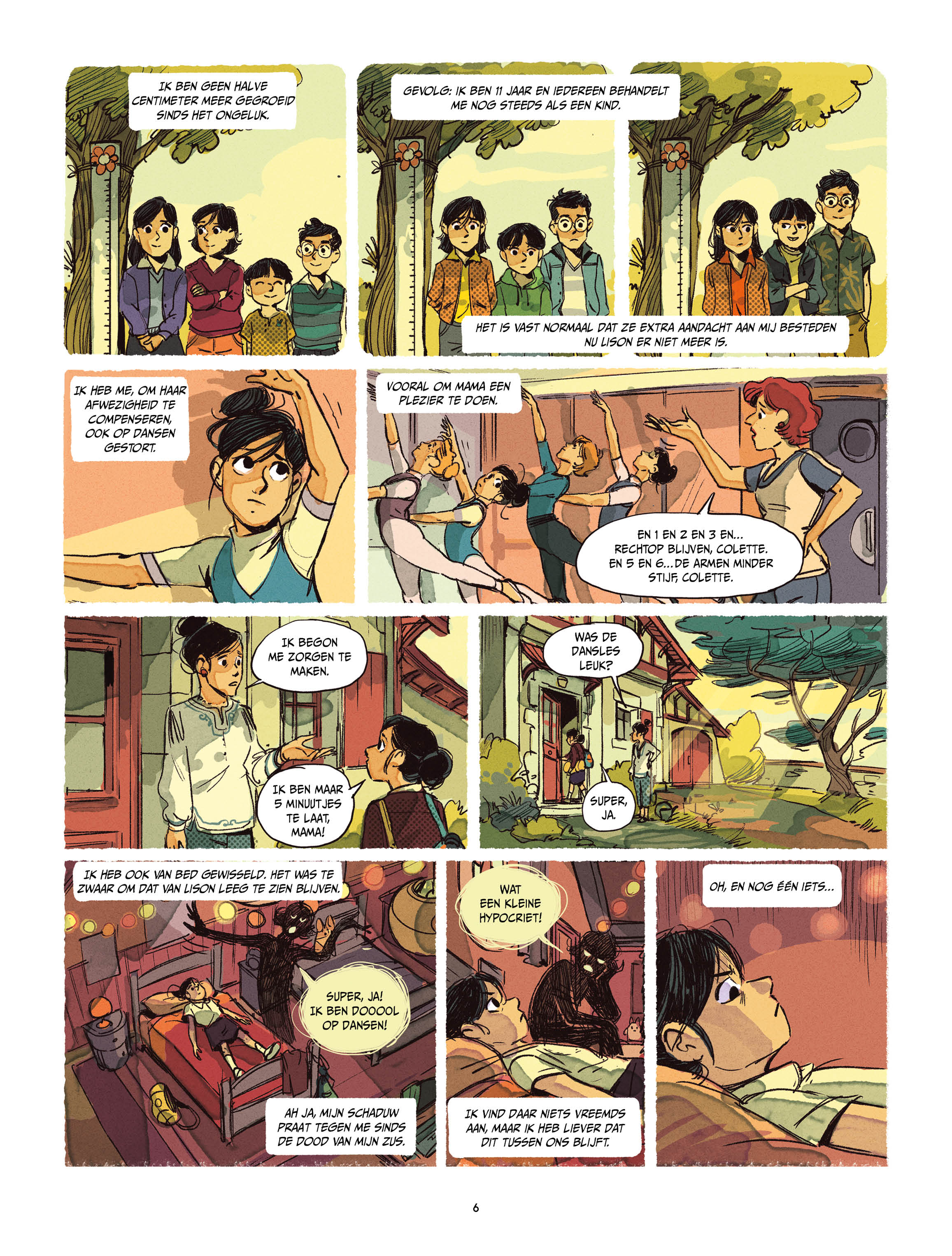 Colette is elf en heeft altijd in de schaduw van haar tweelingzus Lison geleefd: de mooiste, de meest talentvolle, de ster van de klassieke dans. Tot het noodlot toeslaat. Lison sterft bij een auto-ongeval; hun moeder overleeft, maar verliest een arm én lijkt tegelijk haar “lievelingskind” kwijt te zijn. Sindsdien staat Colette’s leven stil: ze voelt zich klein, wordt op school bekeken als “dat fragiele meisje” en probeert – vooral voor haar moeder – de dans voort te zetten waarin Lison uitblonk. Alleen: Colette’s verdriet krijgt letterlijk een stem, want haar schaduw praat tegen haar en jaagt haar voortdurend op.