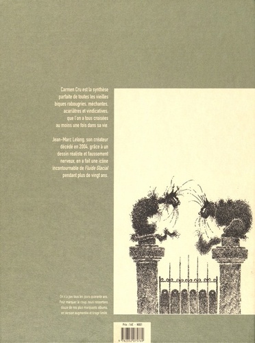 Les 40 ans de Fluide Glacial à travers 12 albums majeurs en version limitée Quand Lelong propose Carmen Cru à Fluide Glacial en 1981, la rédaction est un peu dubitative. « Une héroïne vieille, affreuse, moche et méchante dans un journal jeune, bête et rock'n'roll, ça risque de faire tache ». En plus, le trait suranné du dessinateur n'arrange pas l'affaire… Ça va vraiment faire peur au lecteur ! Il faut croire que les lecteurs avaient envie de se faire peur, puisque la harpie tout droit sortie du xxie siècle culmine rapidement en tête des « charts ». Les lecteurs en sont dingues et les albums rencontrent un énorme succès. Entre la grand-mère d'Affreux, sales et méchants, d'Ettore Escola et Tatie Danielle d'Etienne Chatilliez, notre créature abominable et informe incarne à elle seule la France de la haine qu'on adore détester. Et pourquoi donc ? Parce qu'on en a tous une dans notre famille pardi. Et que si elle est pas comme ça, c'est que ça va pas tarder ! À l'instar des « Bidochon », la « Carmen Cru » est entrée dans le langage courant : « La concepige, c'était une vermine. La moindre bribe de vos discussions qu'elle esgourdait à la dérobée, elle se la mettait dans un tiroir et la ressortait aux lardus à la moindre occasion. Une vraie Carmen Cru ». Robert Balougeot, mémoires d'Outre-France, Stock.