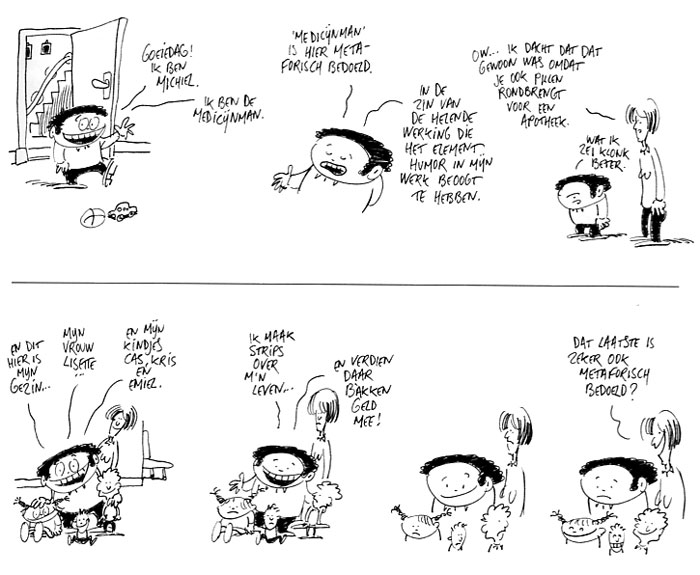 Medicijnman is een autobiografische strip, waarbij dingen uit de werkelijkheid aangegrepen worden om op door te fantaseren en grappen over te maken. Daardoor komen de meest uiteenlopende onderwerpen aan bod in deze strip, zoals vissen die sonnetten schrijven, paarden die uit hun gat scheuren, meisjes in kuilen en wolken op pootjes. Aanleiding voor deze onderwerpen is dan bijvoorbeeld een uit zijn verband gerukte opmerking, een kindertekening of zomaar iets wat de tekenaar onderweg is tegengekomen. Aldus de werkelijkheid aanwendend voor grappen, ontstaat er een geheel nieuwe werkelijkheid, namelijk die van de fantasie. Niets van dit alles was echter mogelijk geweest zonder de steun van Michiel's lieve echtgenote en zijn gezin, het belangrijkste stukje werkelijkheid van waaruit Michiel zijn zieke fantasietjes de wereld inslingert. Medicijnman is een fantasievolle, autobiografische humorstrip in de vorm van korte grappen die door zijn schetsmatige tekenstijl lekker wegleest.