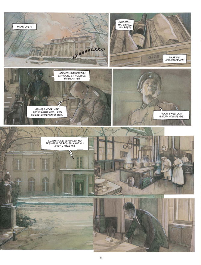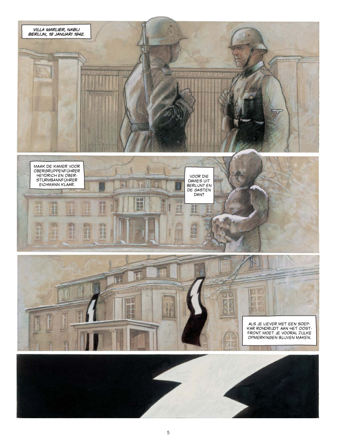 20 januari 1942 in Wannsee, een chique buitenwijk van Berlijn. Vijftien mannen onder wie topambtenaren van het Reich en de SS plegen topoverleg in een discrete villa aan de oevers van het meer. De vergadering is bijeengeroepen door SS-functionaris Adolf Eichmann en wordt voorgezeten door Heydrich. Ze duurt nauwelijks anderhalf uur maar is allesbepalend voor de organisatie van de Shoah en bezegelt daarmee het lot van miljoenen mensen in Europa. Het topoverleg waar de organisatie van de Holocaust in de steigers werd gezet. Een straf gedocumenteerd verhaal over WOII. Door Fabrice Le Hénanff, de auteur van Westfront, Ostfront, De Kameleons, H.H. Holmes.