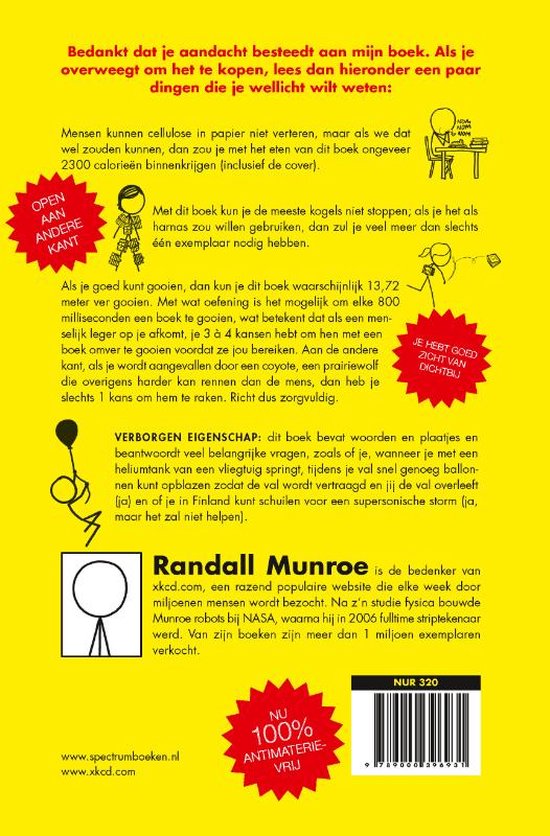 Fans van de razend populaire webcomic xkcd stellen Munroe een heleboel vreemde vragen: wat als je een baseball probeert te raken die met 90% van de snelheid van het licht op je af komt? Hoe hard kun je met een auto over een verkeersdrempel rijden zonder dood te gaan? Als er een robotapocalyps zou zijn, hoe lang zou de mens het dan overleven? Wat als iedereen maar één zielsverwant had? Wat zou er gebeuren als de maan opeens verdwijnt?