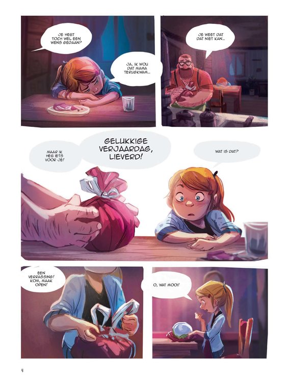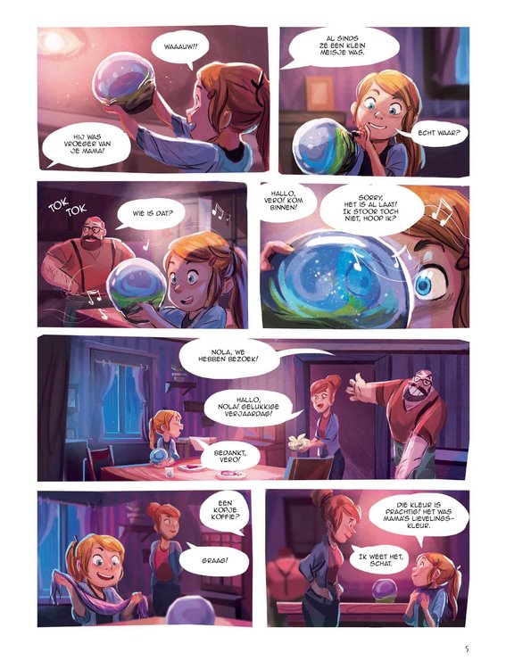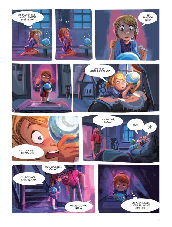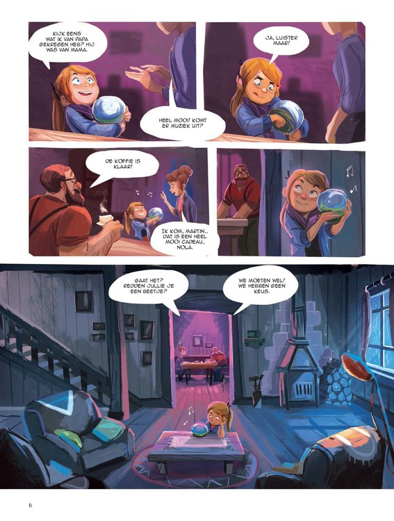 Nola wordt acht en krijgt van haar papa een sneeuwbol met muziek cadeau. Ze is dolblij met de bol, die nog van haar pas overleden mama is geweest. Maar binnenin zit Andrea opgesloten, een piepklein meisje dat haar hulp inroept. Nola wordt zelf ook klein, kruipt in de doos en ontdekt er een wonderbaarlijke wereld ... Maar de tijd dringt: Mathilda, de mama van Andrea en haar broer Igor, is heel ziek ... Wat is haar overkomen? Is ze vergiftigd? Zou er iets in het drinkwater zitten? Hun vrees wordt al snel bewaarheid. De kinderen ontfermen zich eerst over Mathilda en maken dan jacht op de gewetenloze vervuiler. Ze moeten snel zijn, vóór Nola weer naar haar eigen leven en wereld wordt teruggeroepen. Tenzij het allemaal maar een droom is ... Of toch niet? Duik in de wondere wereld van Nola's sneeuwbol: een betoverende nieuwe kinderreeks die actuele thema's op een fantasievolle manier aansnijdt. In dit album: vervuiling. Onderwijzeres en schooldirectrice Carbone is een gevierd kinderboekenschrijfster die zich nu ook aan stripverhalen waagt. Debuut van het jonge Congolese tekentalent Gijé.