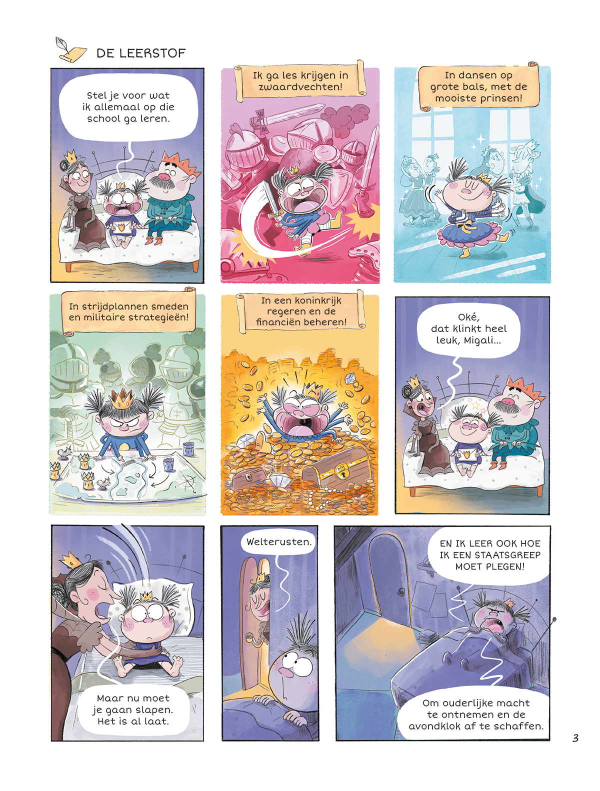 Migali is aangenomen op de prestigieuze Koninklijke Academie! Schermen, klassieke dans en hardlopen voor eenhoorns – kortom, een compleet programma dat past bij haar opleiding tot toekomstig vorstin. Dankzij haar malle streken en haar talent voor het veroorzaken van kleine rampen zal Migali zeker een onuitwisbare indruk maken op de hele klas.