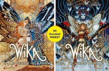 Deel 1 + 2 voordeelpakket 2 x Hardcover 2 x 72 blz Er was eens, niet zo heel lang geleden, een fee met de naam Wika Grimm. Ontsnapt aan het bloedbad van haar adellijke familie, heeft zij, zonder haar vleugels, jarenlang in anonimiteit geleefd en was zo beschermd tegen de razernij van koning Oberon, de moordenaar van haar ouders... Ontmaskerd door haar ware natuur is de achtervolgde, jonge Wika verdwaald in het gebied van de Formoiìri. Nadat ze de wolven van koninklijke bloede die haar op de hielen zaten heeft verslagen, heeft Wika daar de Zwarte Feeën leren kennen, die ook een appeltje te schillen hebben met koning Oberon. Maar de hulp van die duistere petemoeien is niet helemaal belangeloos ... en de prijs die Wika moet betalen om haar krachten te leren beheersen is dat ze een verbond met hen moet sluiten. Ondertussen smeden de tiran en zijn minnares met het stekelhart, de Witte Dame, in Avalon perverse plannen voor hun gezworen vijand Wika. Olivier Ledroit, bekend in de wereld van illustraties en van fantasy-strips, verzorgt met zijn barokke en gedetailleerde tekenstijl een geweldige hervertelling van klassieke fabels in een feeëriek steampunk-universum, op het eerste stripscenario van Thomas Day!