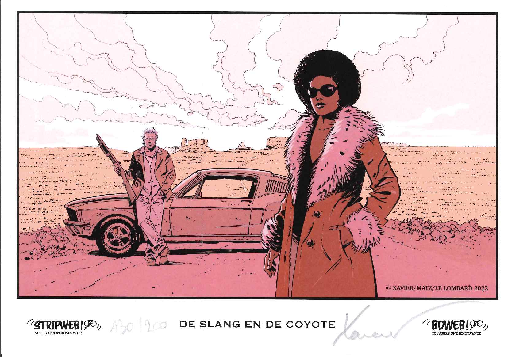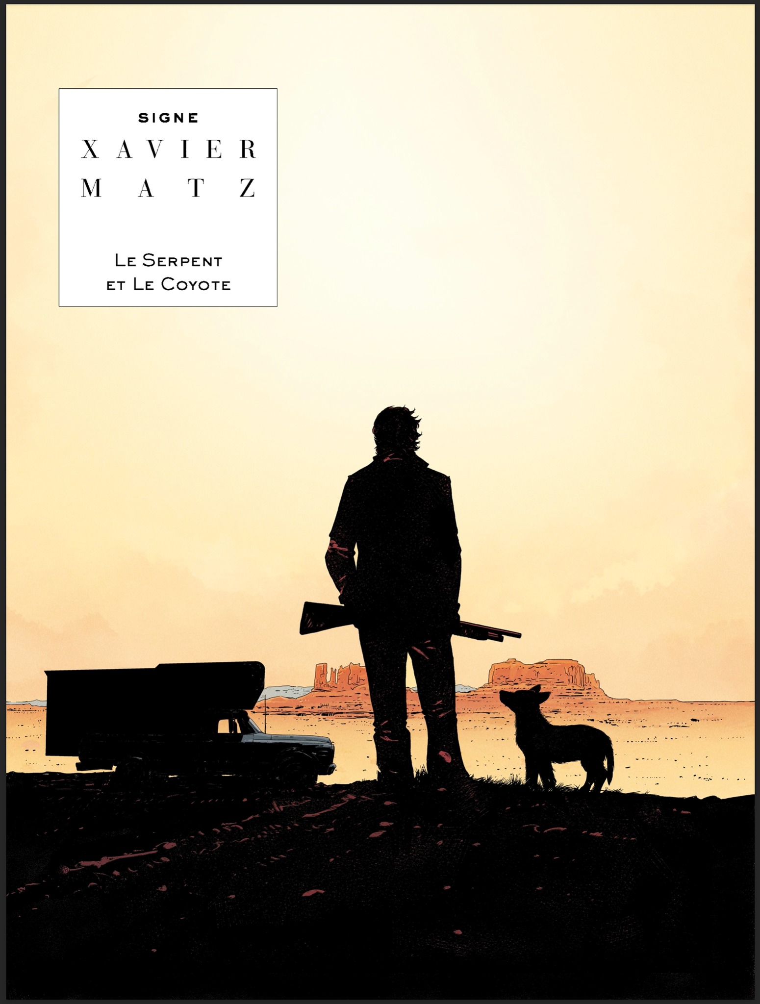Gemiddelde score 5 / 5DE SLANG EN DE COYOTE (Xavier/Matz) Gerald Shur was de bedenker van het Witness Security Program (WITSEC). Een getuigenbeschermingsprogramma opgericht in 1970. Je krijgt als spijtoptant een nieuwe identiteit met officiële papieren. J. Edgar Hoover was geen fan, dus de resultaten mochten niet tegenvallen. Joe 'geniet' van dit programma maar moet opnieuw komen getuigen. US Marshal Carl Crews moet hem in de gaten houden. Via flashbacks, in zwart-wit, komen we te weten hoe Joe zich tijdens de drooglegging had misdragen en rijk werd... zelfs ten koste van zijn 'vrienden'. Vrienden die hij nu liever niet meer zou tegenkomen. Maar is de US Marshal wel te vertrouwen? Zijn enige echte vriend (?) is een coyote die van hem steeds een andere naam krijgt. Samen maken ze een wondermooie, eenzame roadtrip in zijn camper door het Amerikaanse Wilde Westen. En wie weet, misschien komen ze zijn dochter, Monica, wel eens een keertje tegen. Zou ze dan met hem willen spreken? De tekeningen van Philippe Xavier (Kruistocht, Conquistador, Winter 1709, Tango) lijken wel gecomponeerd uit de teksten van Matz (De Killer, Countdown, Cycloop, Tango). De bloedmooie landschappen, neonlichten en dorre woestijnen klinken als muziek in de oren. Verder is het genieten van vele, leuke verwijzingen (Xavier maakte zich op Facebook een beetje druk dat zijn lezers die niet opmerkten): p. 26 + p.63: Vesper p.30: Marini en ook Bruno Brazil en Jerry Spring p.45: Noir Burlesque p.49: Tango was here + p.81: Tango (Comic Books & Stuff) p.104: The Matza Diner (Best Hamburgers & Shakes in Town) Ook prachtige filmaffiches doen ons zin krijgen deze klassiekers opnieuw te bekijken: 12 Angry Men (1957) met Henry Fonda (p.104-105) Touch of Evil (1958) met Charlton Heston, Orson Welles (p.105) Rebel Without a Cause (1955) met James Dean (p.106) Vertigo (1958) met Kim Novak, James Stewart (p.106) Een album om te blijven herlezen!