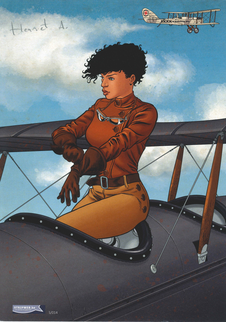 Pakket met de drie delen en een gesigneerde ex-libris laatste 6 exemplaren Tekenaar Henriet tekende ook volgende stripverhalen: 1. Damocles 2. Golden Cup 3. Berentand van de scenarist Yann die we kennen van oa deze stripverhalen 1. Angel Wings 2. Atom Agency ( uitverkocht we hebben er nog enkele) 3. De Jonge jaren van Thorgal 4. De nachtuil 5. De Onnoembaren 6. Edelweiss 7. Govert Suurbier 8. Pin-up 9. Thorgal ( de laatste delen ) 10. Savage en nog vele andere medewerkingen in reeksen als Robbedoes, Spoon en White, Yoni,.... BLACK SQUAW de nieuwe strip van Henriet en Yann de auteurs van Berentand. Terug een verhaal over een pilote, Bessie Coleman. een Afro-Indiaans-Amerikaanse die een obsessie voor het vliegen had, wetende dat het in die tijd ( jaren 20 ) bijna onmogelijk was voor iemand zoals zij. Daarenboven leefde ze in Texas waar de Ku Klux Klan de scepter zwaaide. Bessie kwam in dienst van Al Capone die tijdens de drooglegging alcohol kon laten overvliegen vanuit Franse eilanden niet ver van Canada. Maar natuurlijk niet zonder gevaar van de Amerikaanse kustwacht. Ook de Ku Klux Klan was in die periode oppermachtig, zelfs de toenmalig president was hen goedgezind, waardoor Bessie ook dit als extra gevaar bij krijgt. De tekenstijl is terug zeer fijn afgewerkt. Wat nieuw was voor Henriet is het tekenen van de paarden maar daar valt niet veel van te merken. De vliegtuigen daarentegen is wel zijn ding en hier laat hij Bessie vliegen in een Curtis Jenny JN-4. Tienduizenden hebben ze ervan gemaakt tijdens de eerste WO. Daarna werden ze verkocht voor een appel en een ei en bezat vrijwel iedere landbouwer er één om zijn velden te besproeien. Op echte feiten geïnspireerd maar toch fictie. Haar verhaal leest als een roman en er komen twee cycli van drie delen. En... Yann is reeds gestart met het scenario van het vervolg op Berentand... dus voor de liefhebbers die op de hoogte willen blijven van deze reeks schrijf je best in op de reeks berentand